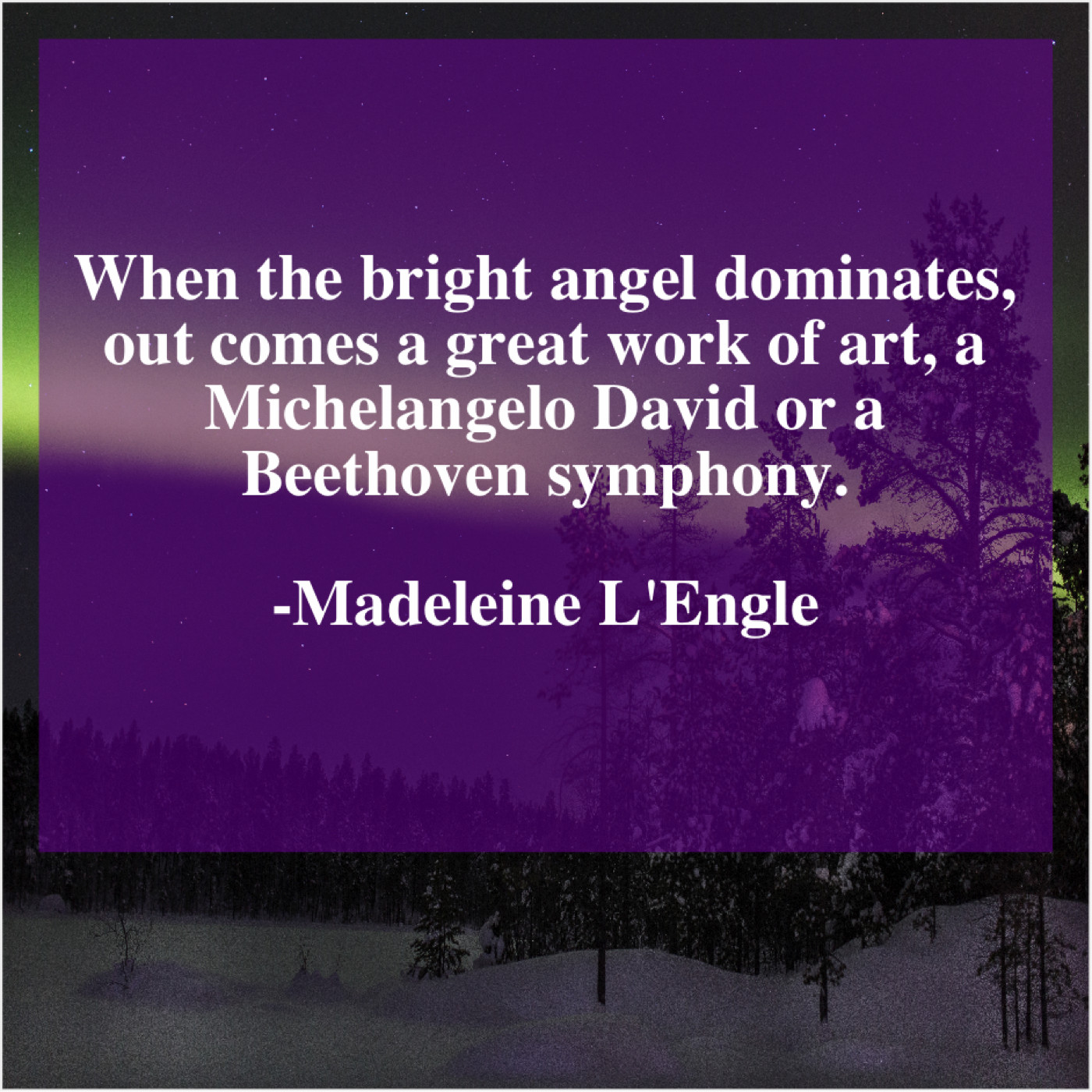 Madeleine L'Engle Madeleine L’Engle – When the bright angel dominates… March 14, 2019 admin “When the bright angel dominates, out comes a great work of art, a Michelangelo David or a Beethoven symphony.”-Madeleine L’Engle