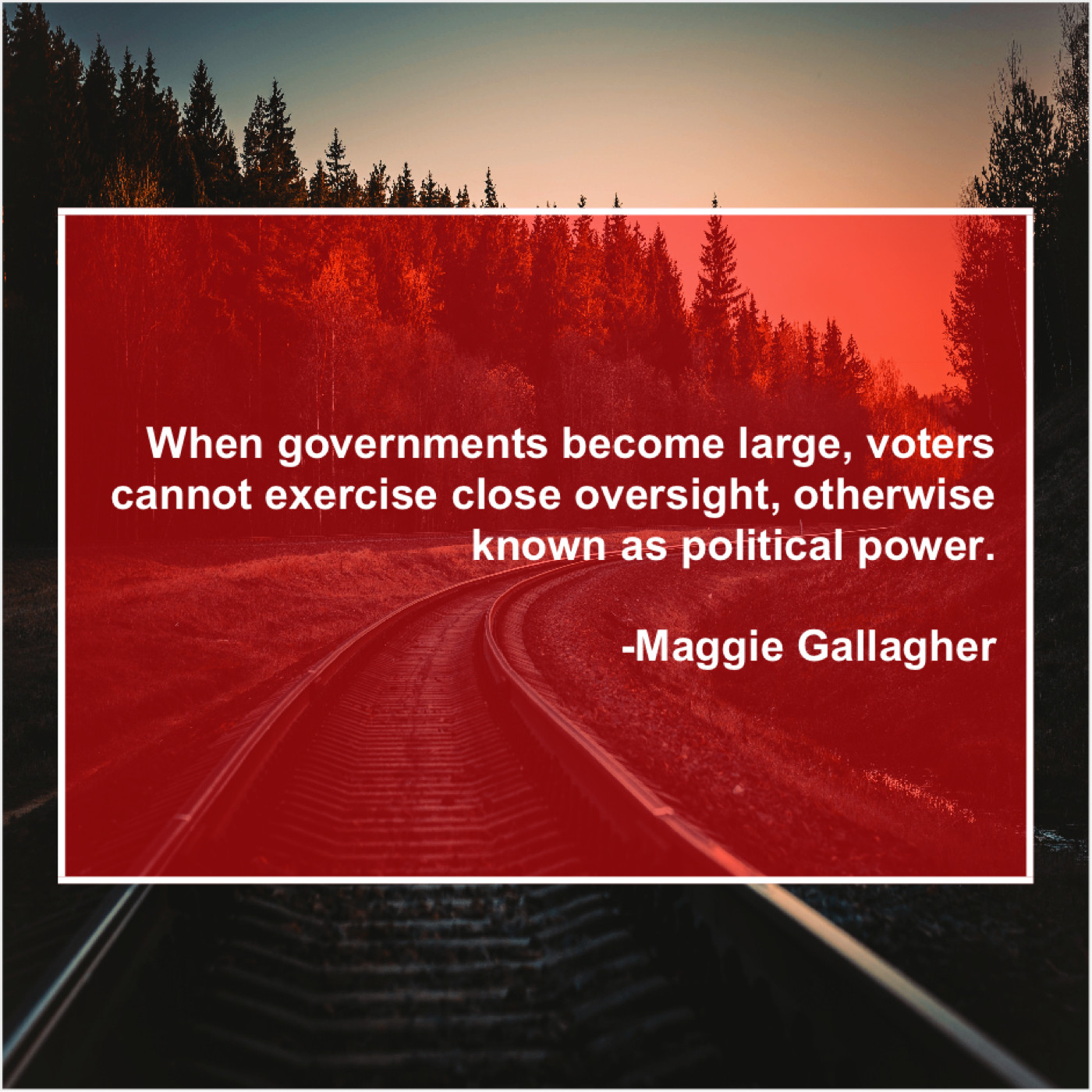 Maggie Gallagher Maggie Gallagher – When governments become large, voters… August 26, 2019 admin “When governments become large, voters cannot exercise close oversight, otherwise known as political power.”-Maggie Gallagher