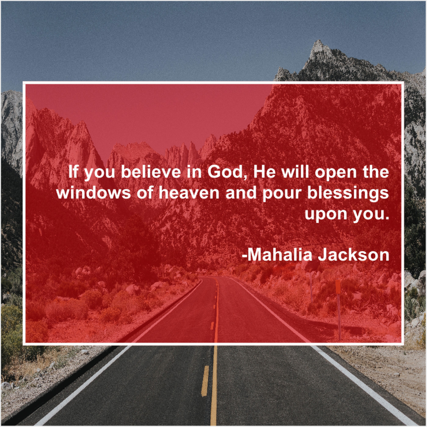 Mahalia Jackson Mahalia Jackson – If you believe in God… October 13, 2019 admin “If you believe in God, He will open the windows of heaven and pour blessings upon you.”-Mahalia Jackson