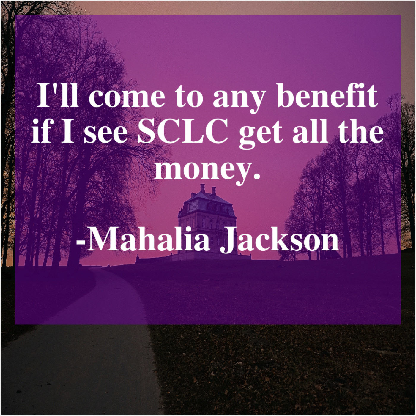 Mahalia Jackson Mahalia Jackson – I’ll come to any benefit… June 10, 2019 admin “I’ll come to any benefit if I see SCLC get all the money.”-Mahalia Jackson