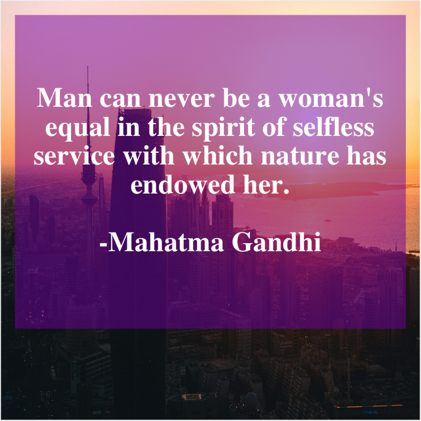 Mahatma Gandhi Mahatma Gandhi – Man can never be a… August 27, 2019 admin “Man can never be a woman’s equal in the spirit of selfless service with which nature has endowed her.”-Mahatma Gandhi