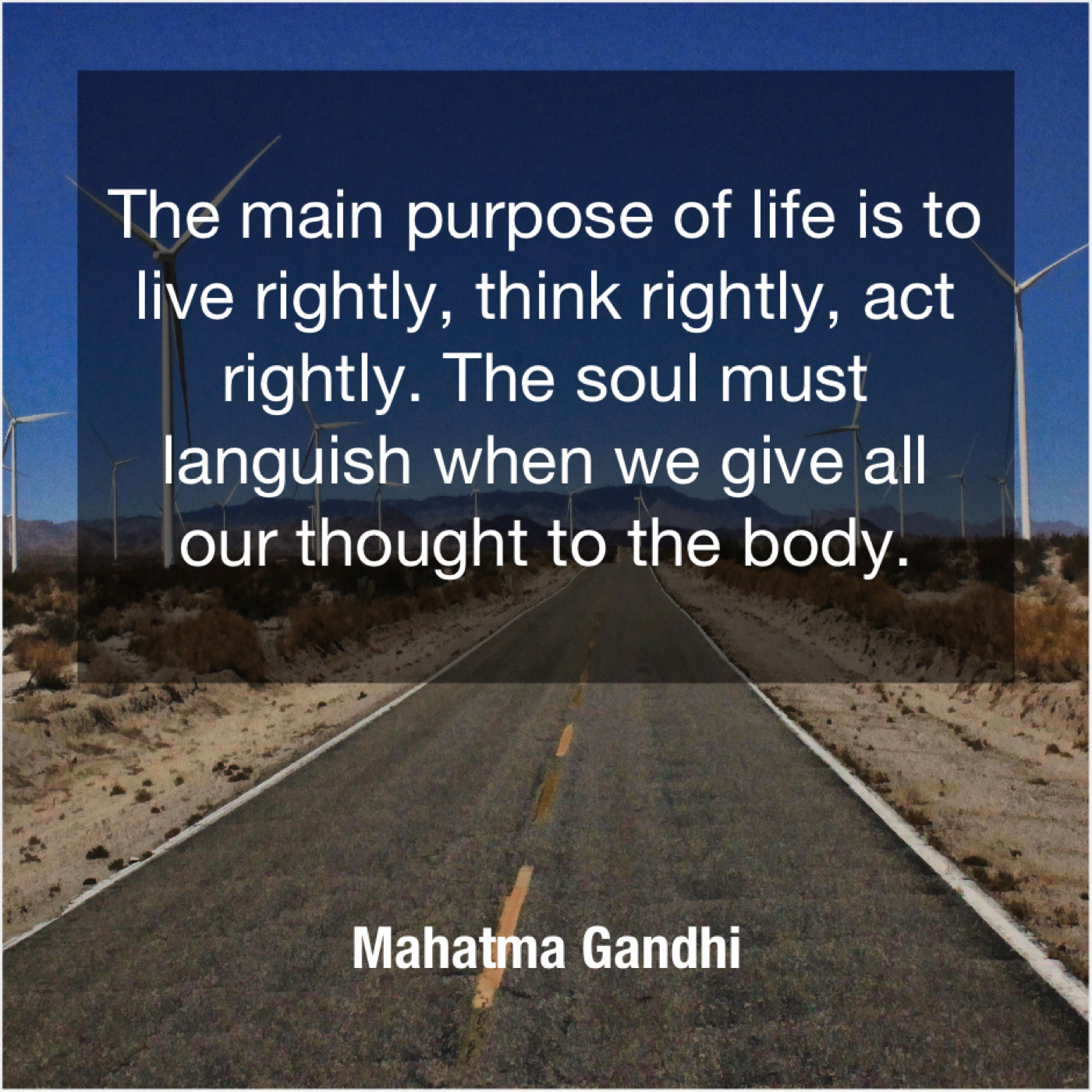 Mahatma Gandhi Mahatma Gandhi – The main purpose of life… December 3, 2018 admin “The main purpose of life is to live rightly, think rightly, act rightly. The soul must languish when we give all our thought to the body.”-Mahatma Gandhi