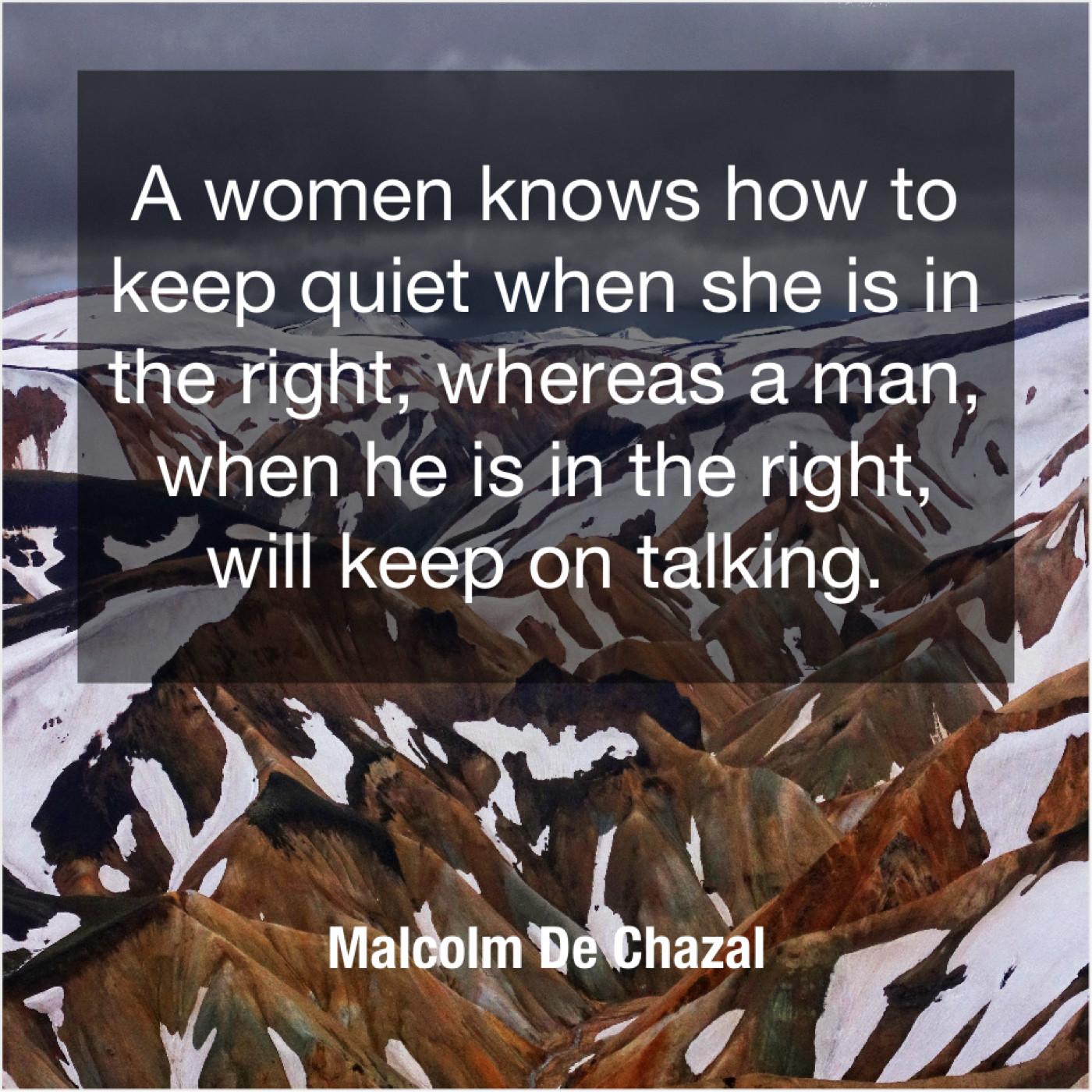 Malcolm De Chazal Malcolm De Chazal – A women knows how to… March 13, 2019 admin “A women knows how to keep quiet when she is in the right, whereas a man, when he is in the right, will keep on talking.”-Malcolm De Chazal