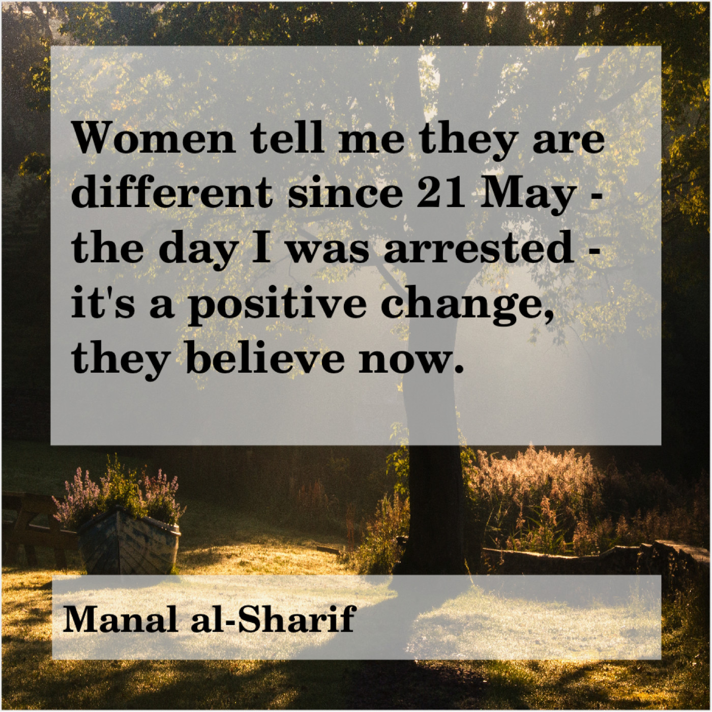 Manal al-Sharif Manal al-Sharif – Women tell me they are… February 14, 2019 admin “Women tell me they are different since 21 May – the day I was arrested – it’s a positive change, they believe now.”-Manal al-Sharif