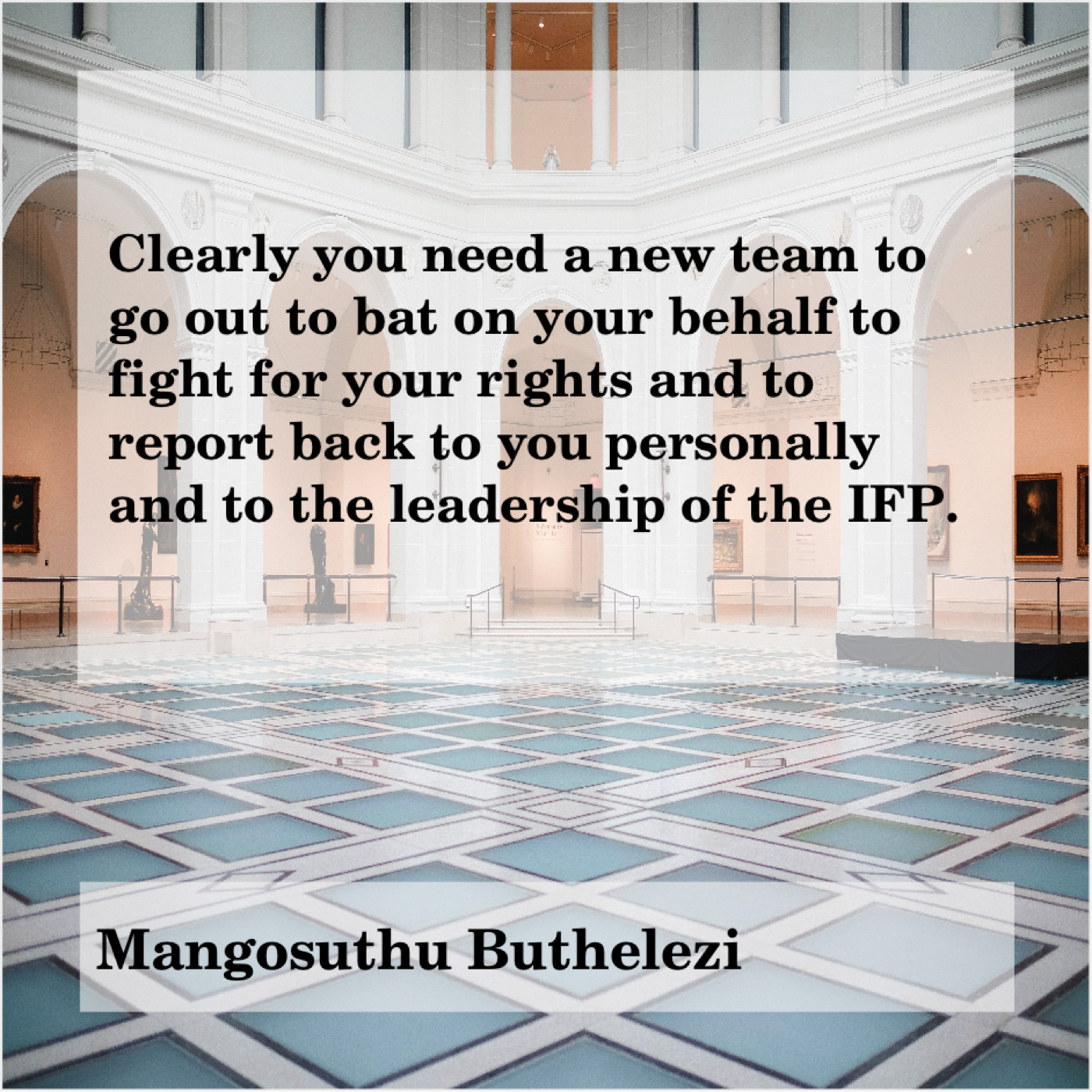 Mangosuthu Buthelezi Mangosuthu Buthelezi – Clearly you need a new… June 8, 2019 admin “Clearly you need a new team to go out to bat on your behalf to fight for your rights and to report back to you personally and to the leadership of the IFP.”-Mangosuthu Buthelezi