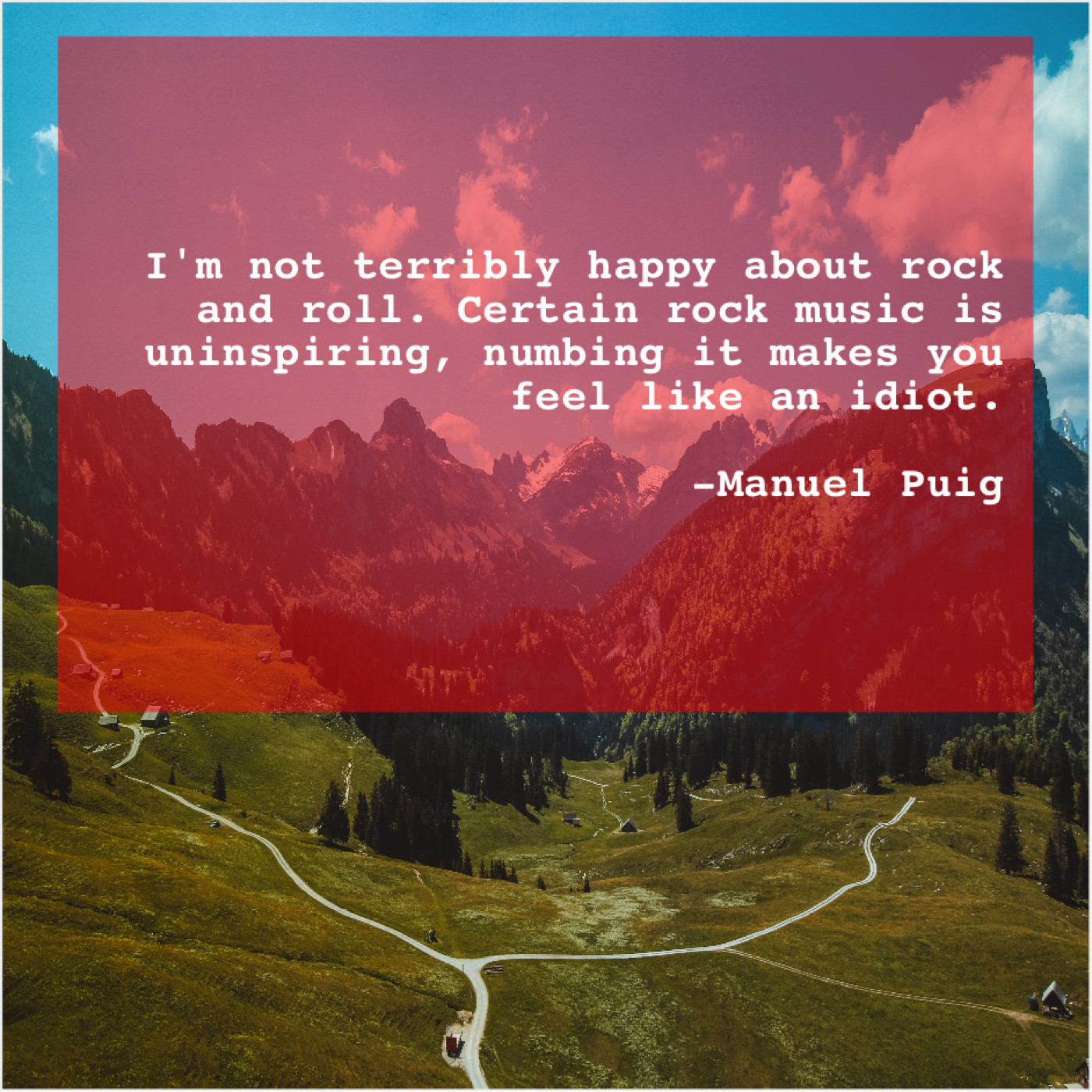 Manuel Puig Manuel Puig – I’m not terribly happy about… March 18, 2019 admin “I’m not terribly happy about rock and roll. Certain rock music is uninspiring, numbing it makes you feel like an idiot.”-Manuel Puig