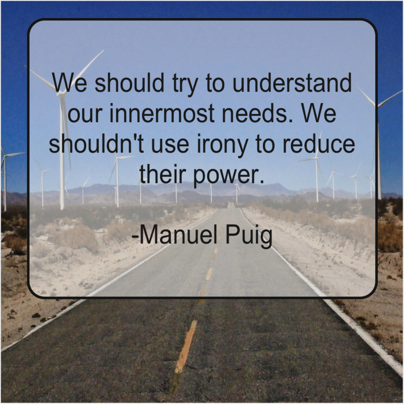 Manuel Puig Manuel Puig – We should try to understand… October 4, 2019 admin “We should try to understand our innermost needs. We shouldn’t use irony to reduce their power.”-Manuel Puig