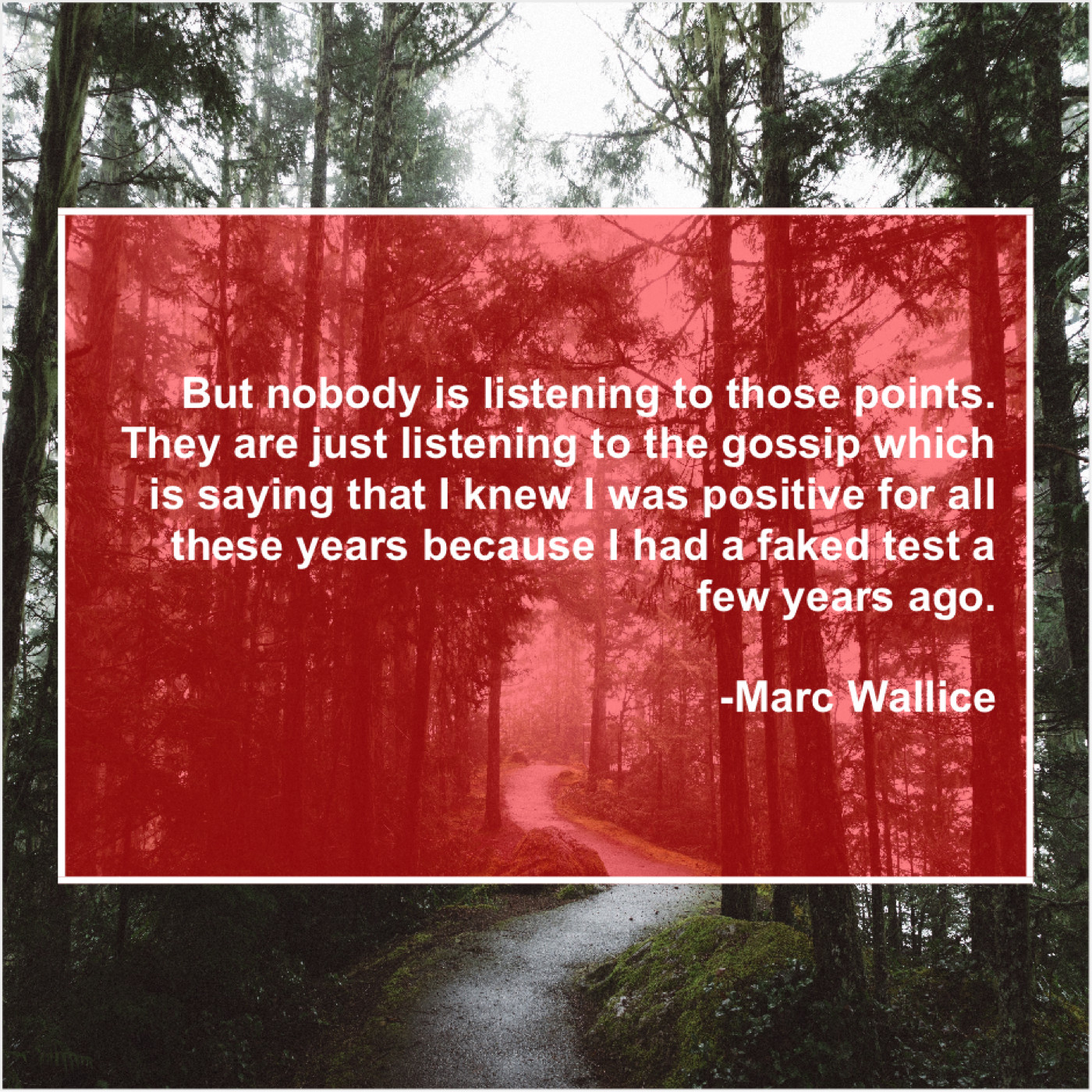 Marc Wallice Marc Wallice – But nobody is listening to… October 4, 2019 admin “But nobody is listening to those points. They are just listening to the gossip which is saying that I knew I was positive for all these years because I had a faked test a few years ago.”-Marc Wallice