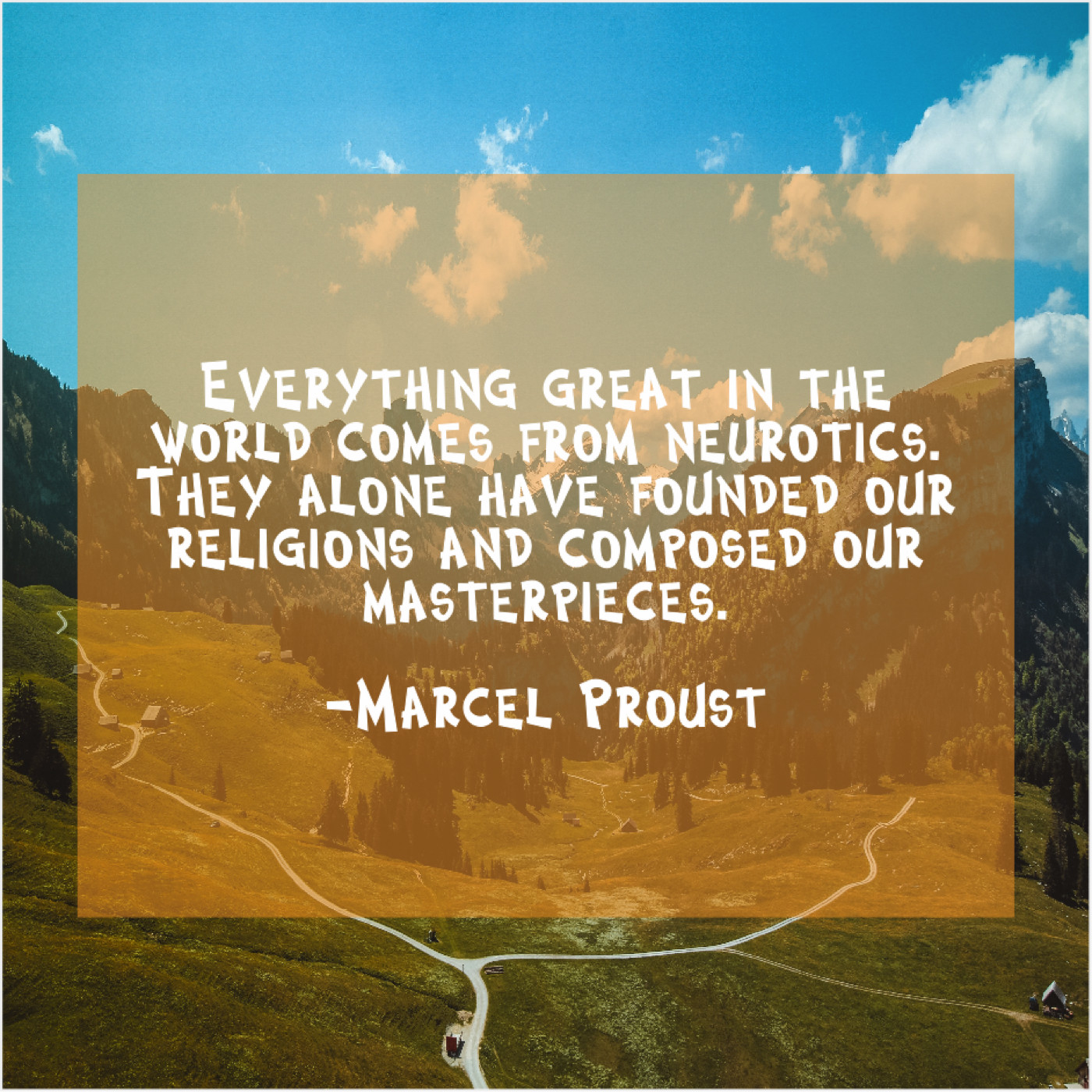 Marcel Proust Marcel Proust – Everything great in the world… October 5, 2019 admin “Everything great in the world comes from neurotics. They alone have founded our religions and composed our masterpieces.”-Marcel Proust