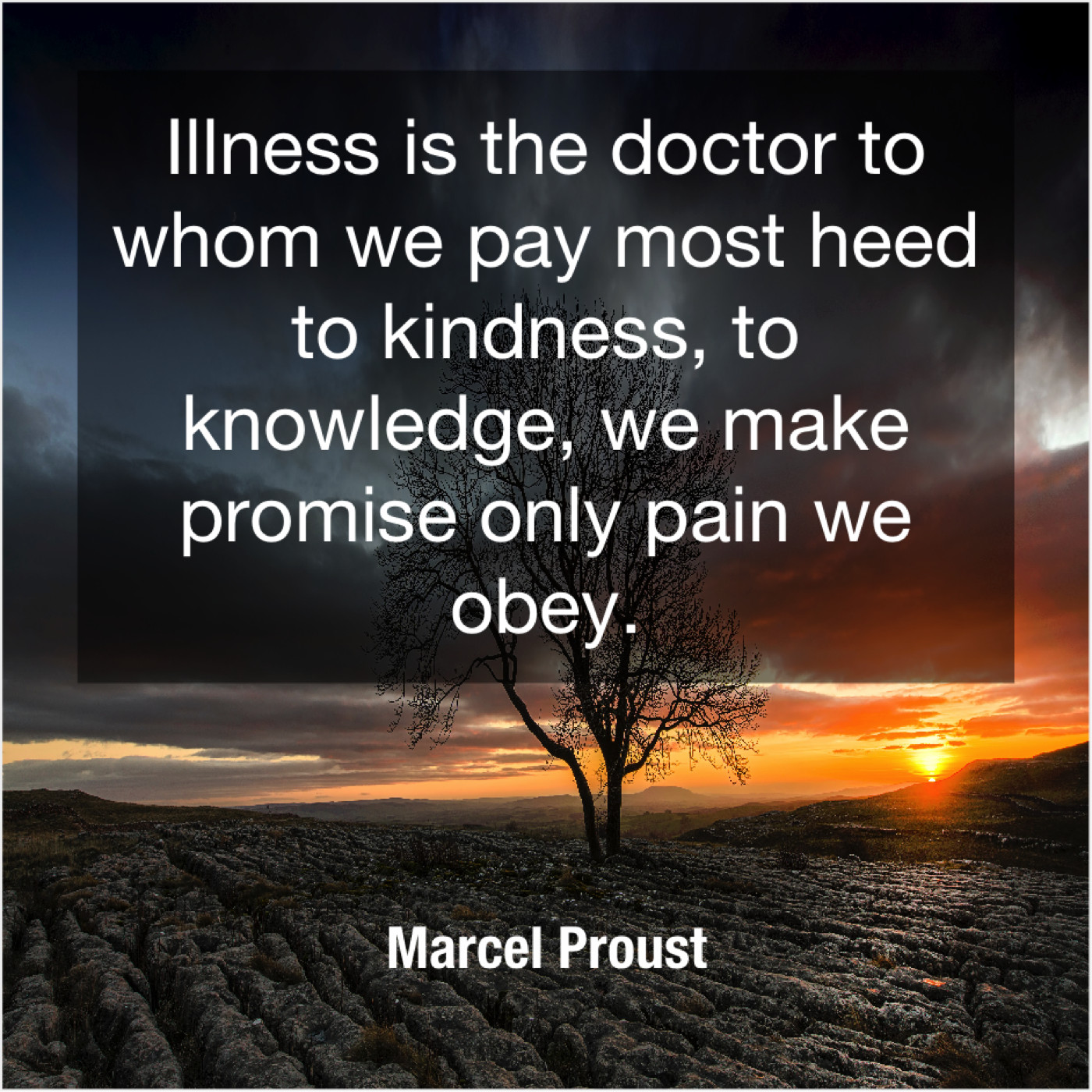 Marcel Proust Marcel Proust – Illness is the doctor to… July 5, 2019 admin “Illness is the doctor to whom we pay most heed to kindness, to knowledge, we make promise only pain we obey.”-Marcel Proust