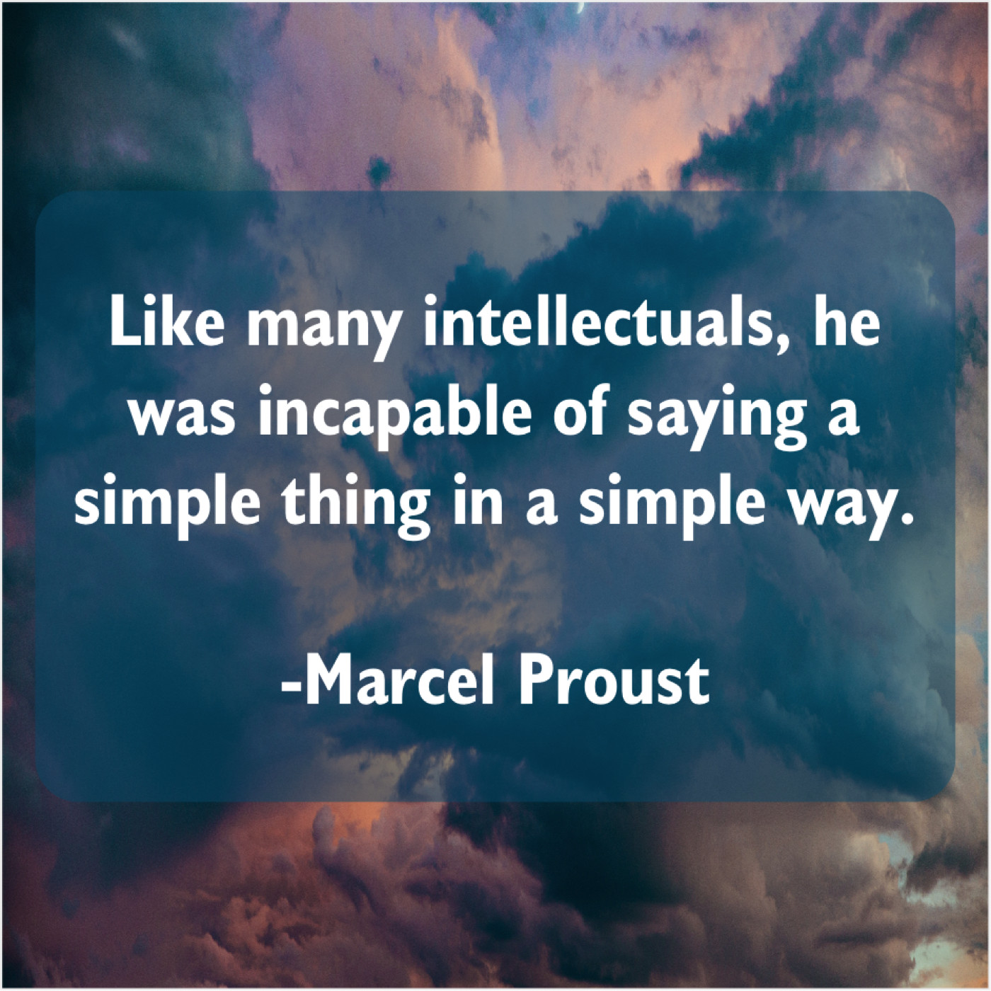 Marcel Proust Marcel Proust – Like many intellectuals, he was… March 29, 2019 admin “Like many intellectuals, he was incapable of saying a simple thing in a simple way.”-Marcel Proust