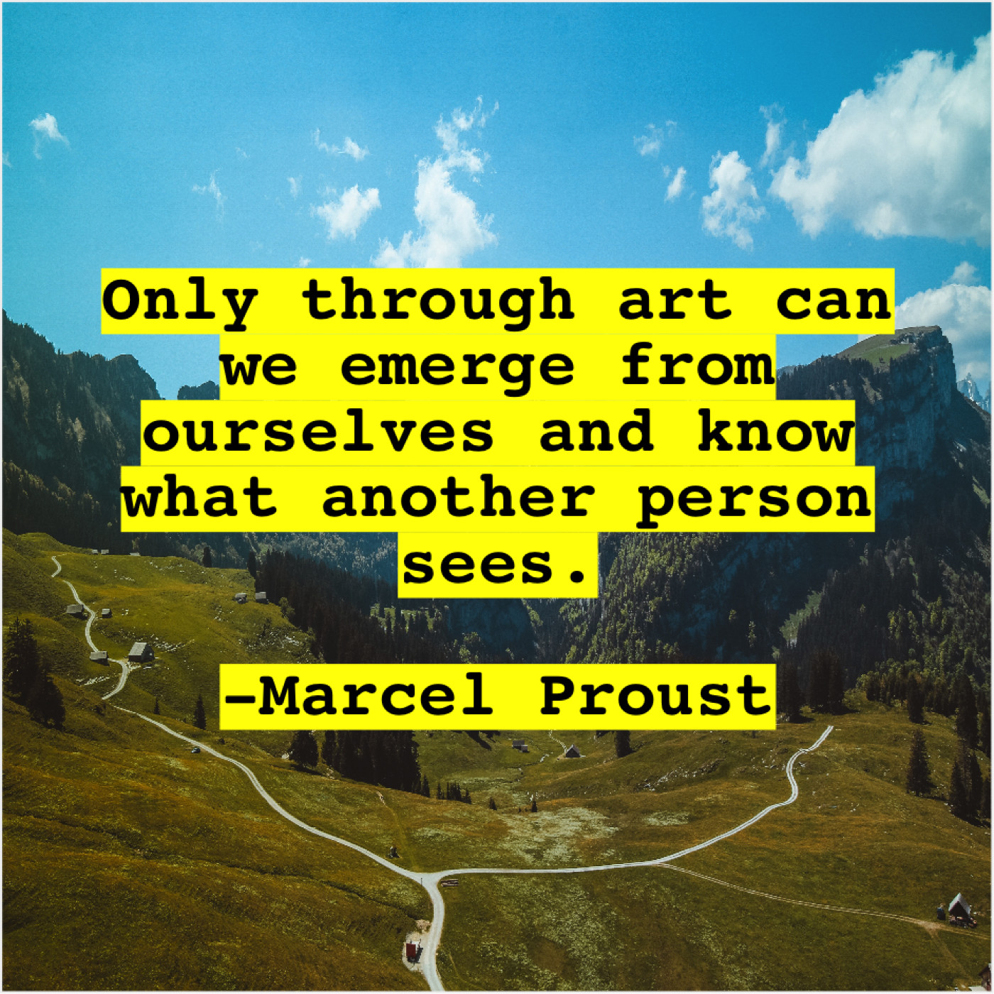 Marcel Proust Marcel Proust – Only through art can we… August 10, 2019 admin “Only through art can we emerge from ourselves and know what another person sees.”-Marcel Proust