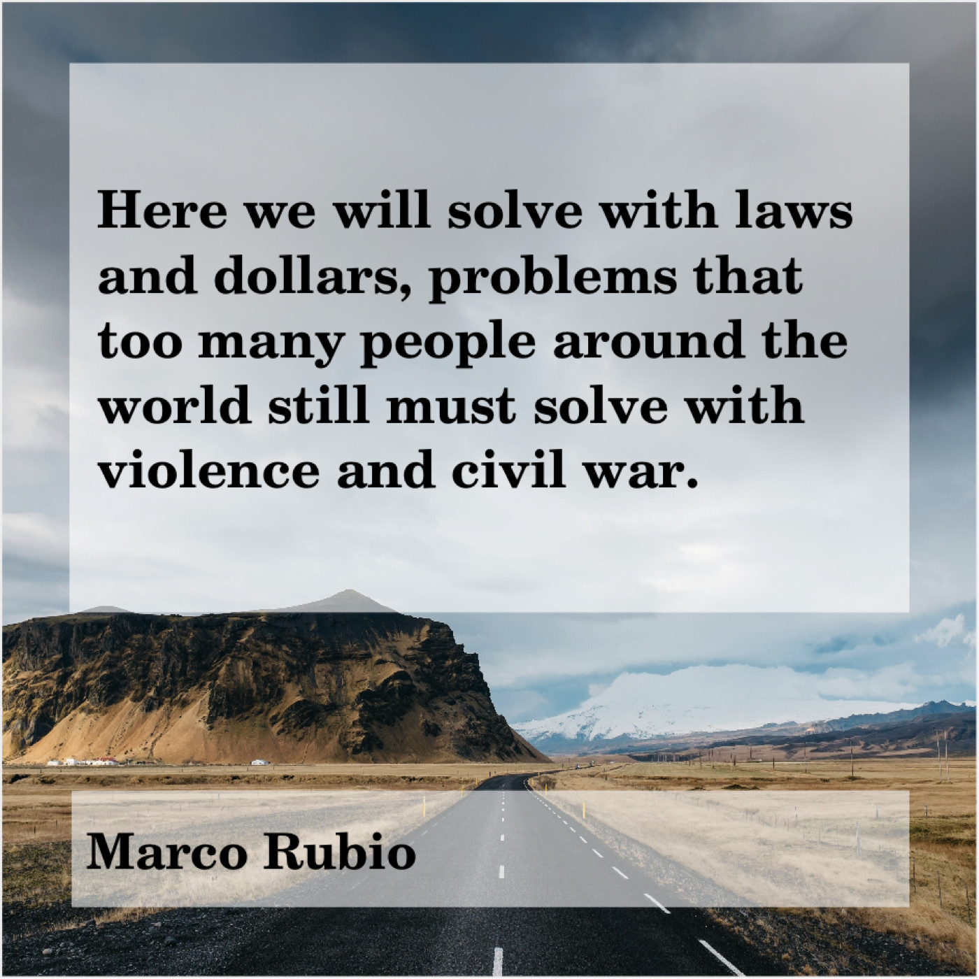 Marco Rubio Marco Rubio – Here we will solve with… June 24, 2019 admin “Here we will solve with laws and dollars, problems that too many people around the world still must solve with violence and civil war.”-Marco Rubio