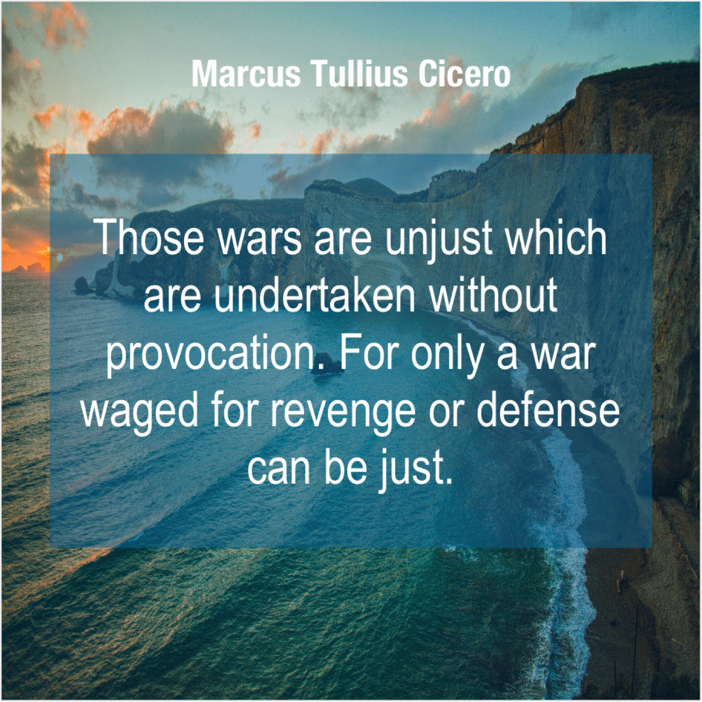 Marcus Tullius Cicero Marcus Tullius Cicero – Those wars are unjust which… January 2, 2019 admin “Those wars are unjust which are undertaken without provocation. For only a war waged for revenge or defense can be just.”-Marcus Tullius Cicero