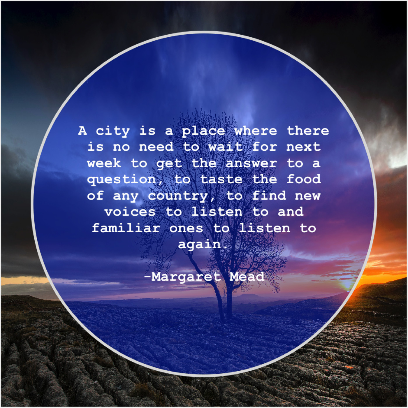 Margaret Mead Margaret Mead – A city is a place… August 23, 2019 admin “A city is a place where there is no need to wait for next week to get the answer to a question, to taste the food of any country, to find new voices to listen to and familiar ones to listen to again.”-Margaret Mead