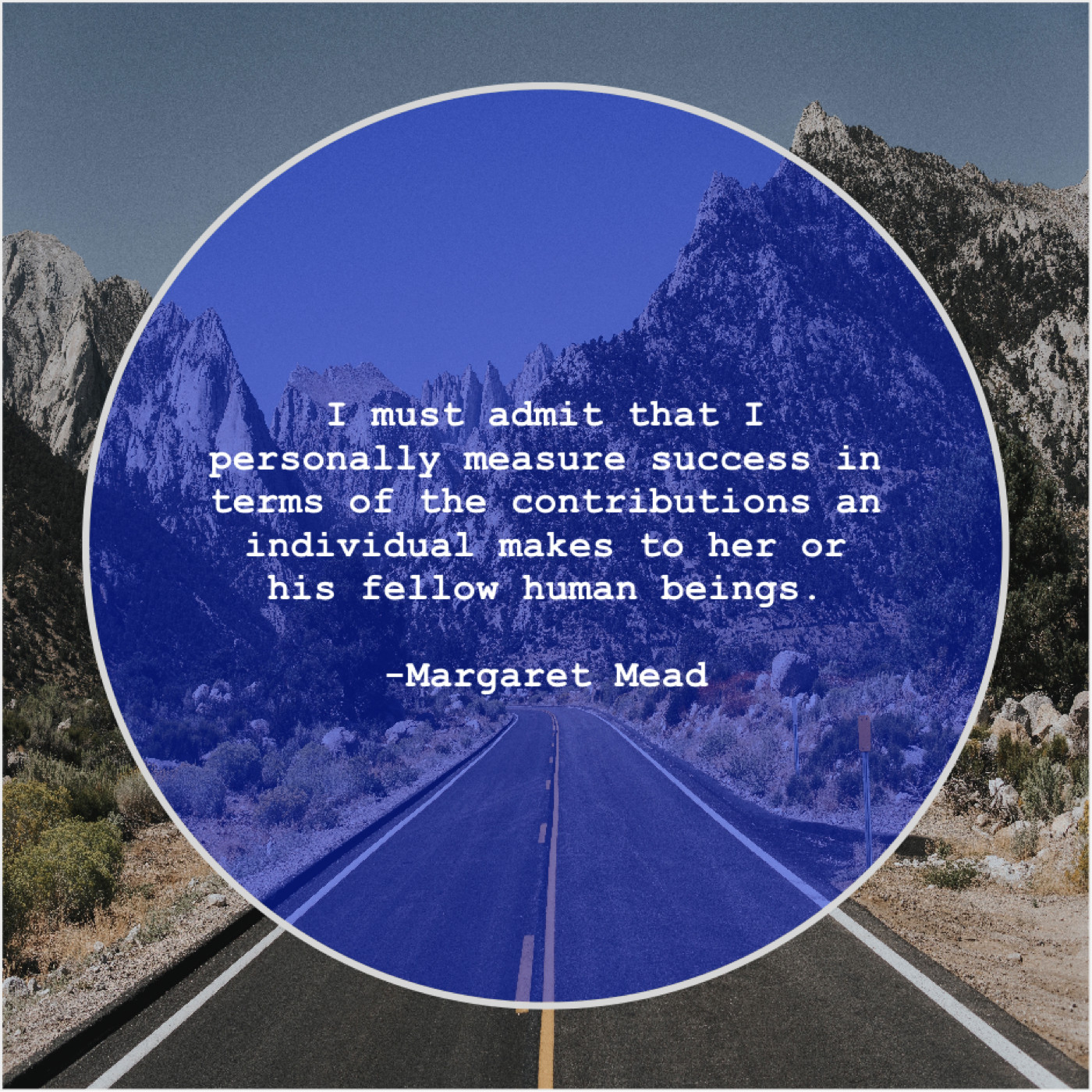 Margaret Mead Margaret Mead – I must admit that I… June 10, 2019 admin “I must admit that I personally measure success in terms of the contributions an individual makes to her or his fellow human beings.”-Margaret Mead