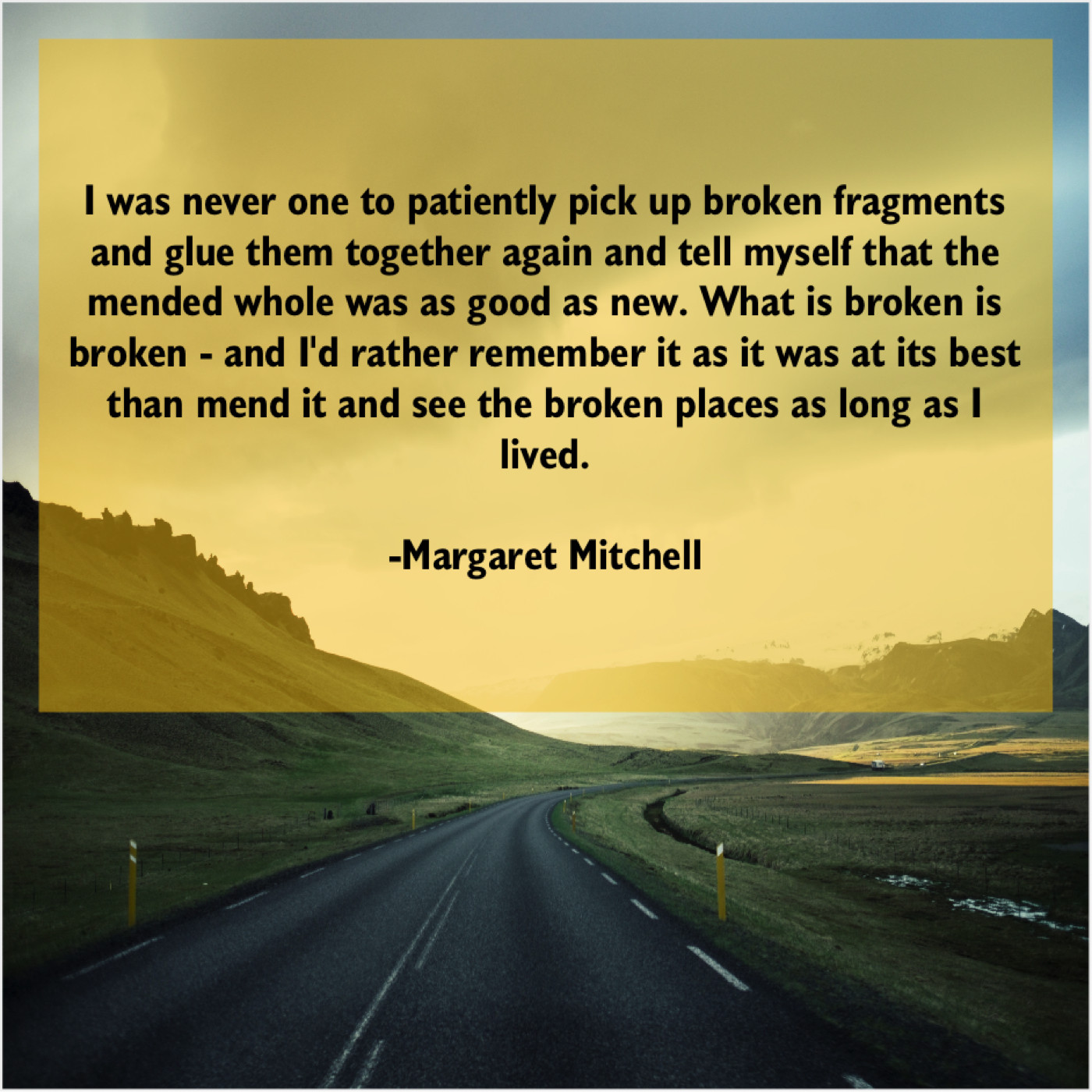 “I was never one to patiently pick up broken fragments and glue them together again and tell myself that the mended whole was as good as new. What is broken is broken – and I’d rather remember it as it was at its best than mend it and see the broken places as long as I lived.”
