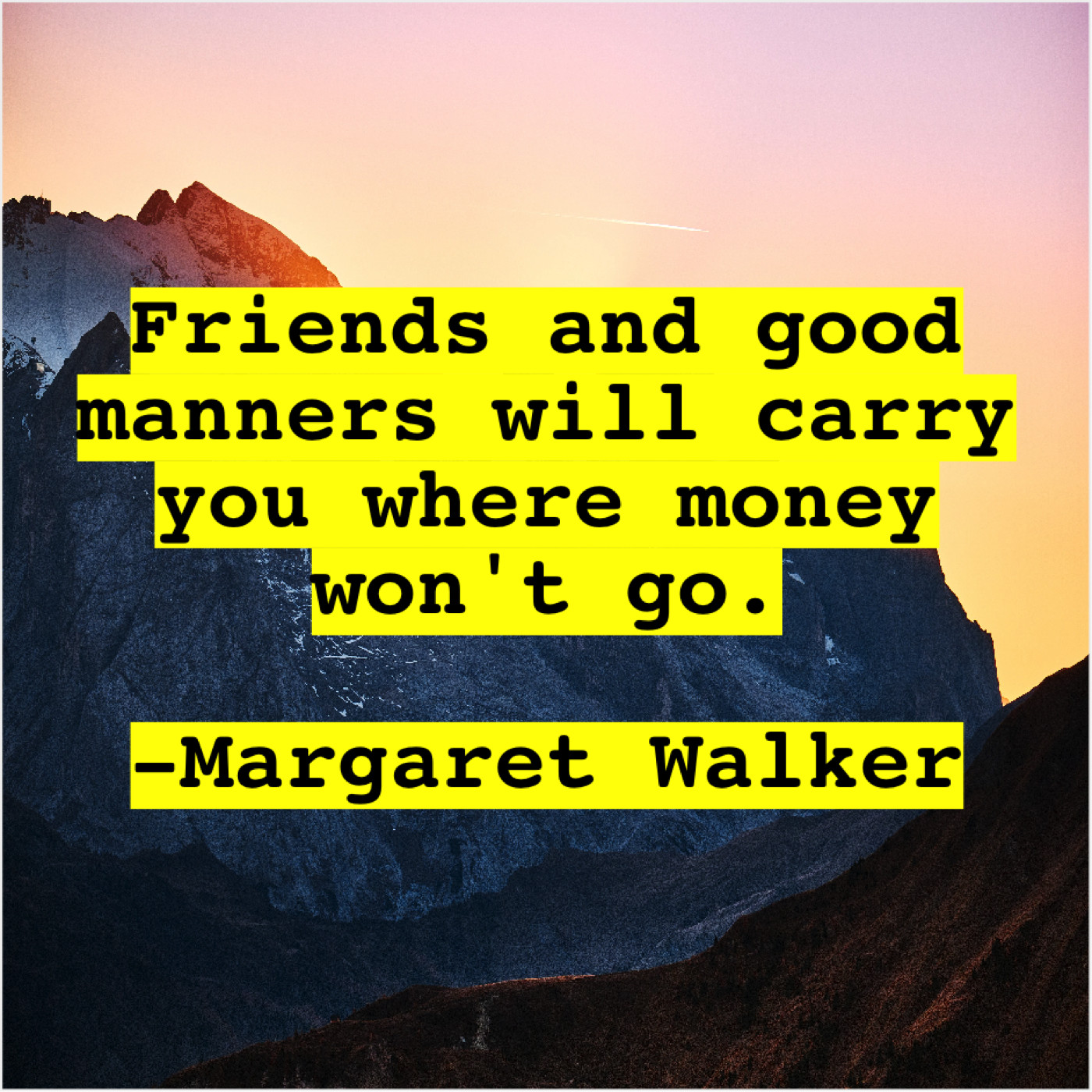 Margaret Walker Margaret Walker – Friends and good manners will… May 29, 2019 admin “Friends and good manners will carry you where money won’t go.”-Margaret Walker