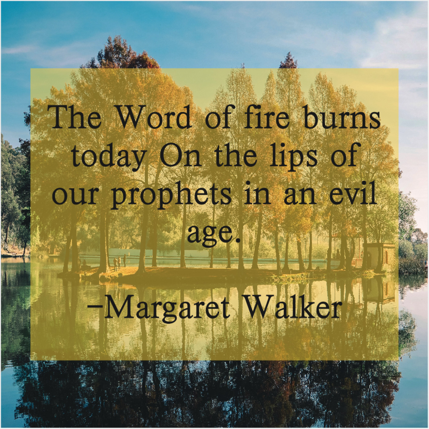 Margaret Walker Margaret Walker – The Word of fire burns… November 15, 2018 admin “The Word of fire burns today On the lips of our prophets in an evil age.”-Margaret Walker