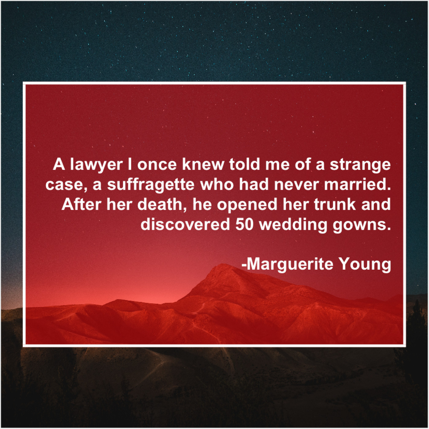 Marguerite Young Marguerite Young – A lawyer I once knew… April 29, 2019 admin “A lawyer I once knew told me of a strange case, a suffragette who had never married. After her death, he opened her trunk and discovered 50 wedding gowns.”-Marguerite Young