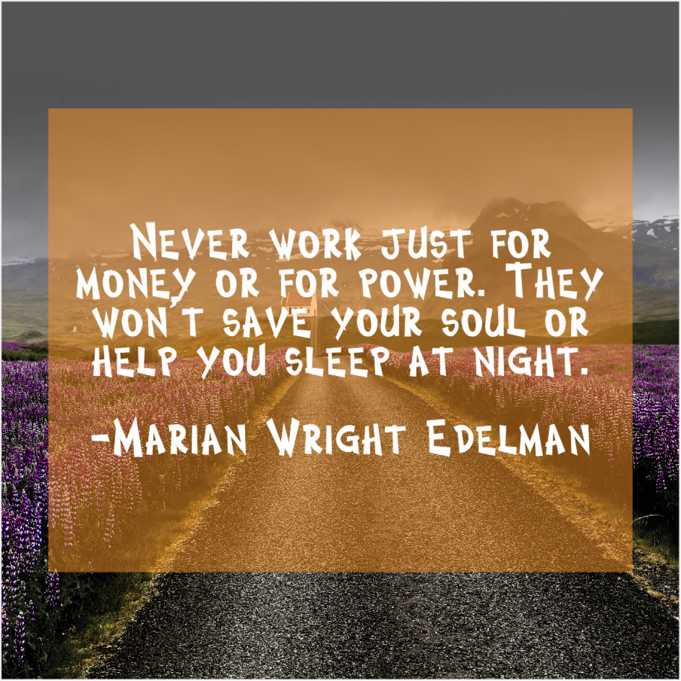 Marian Wright Edelman Marian Wright Edelman – Never work just for money… August 1, 2019 admin “Never work just for money or for power. They won’t save your soul or help you sleep at night.”-Marian Wright Edelman