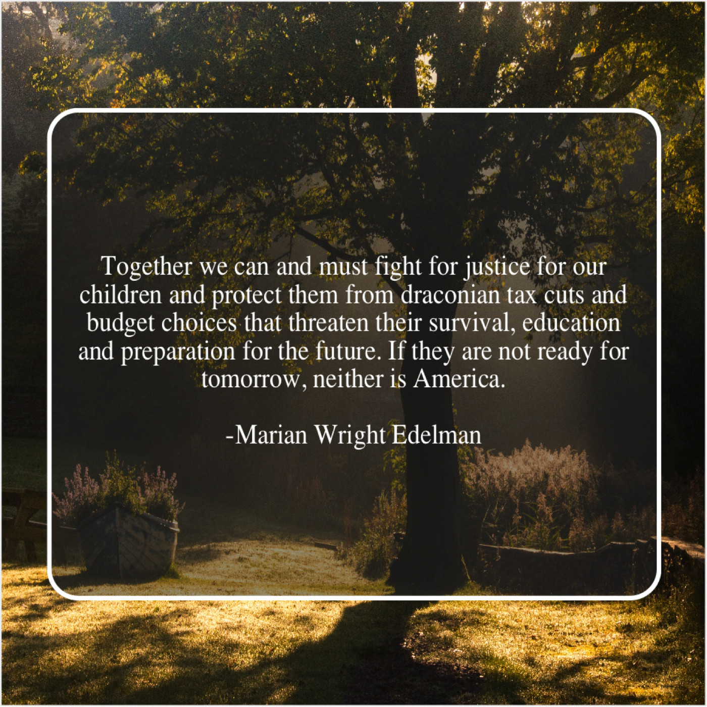 “Together we can and must fight for justice for our children and protect them from draconian tax cuts and budget choices that threaten their survival, education and preparation for the future. If they are not ready for tomorrow, neither is America.”
