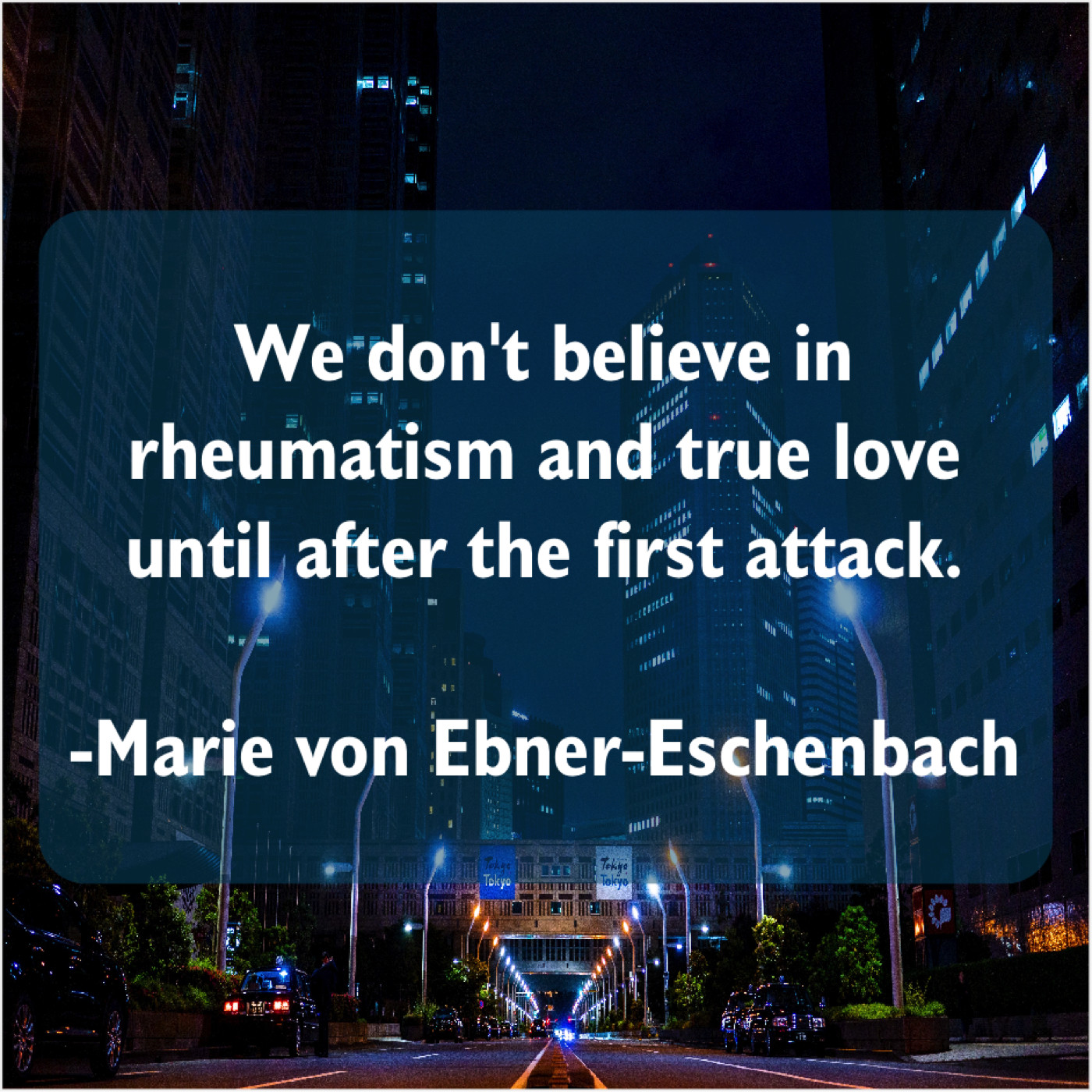 Marie von Ebner-Eschenbach Marie von Ebner-Eschenbach – We don’t believe in rheumatism… November 10, 2018 admin “We don’t believe in rheumatism and true love until after the first attack.”-Marie von Ebner-Eschenbach