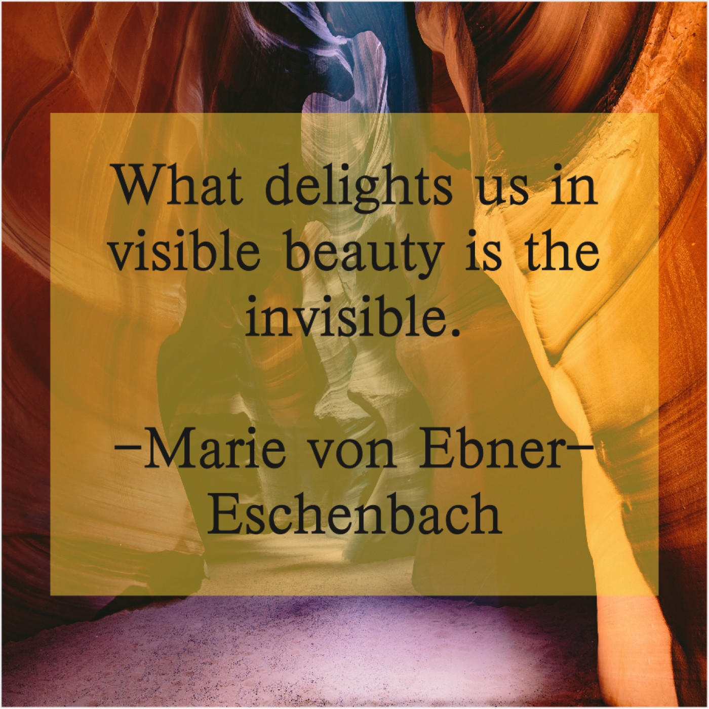 Marie von Ebner-Eschenbach Marie von Ebner-Eschenbach – What delights us in visible… July 26, 2019 admin “What delights us in visible beauty is the invisible.”-Marie von Ebner-Eschenbach