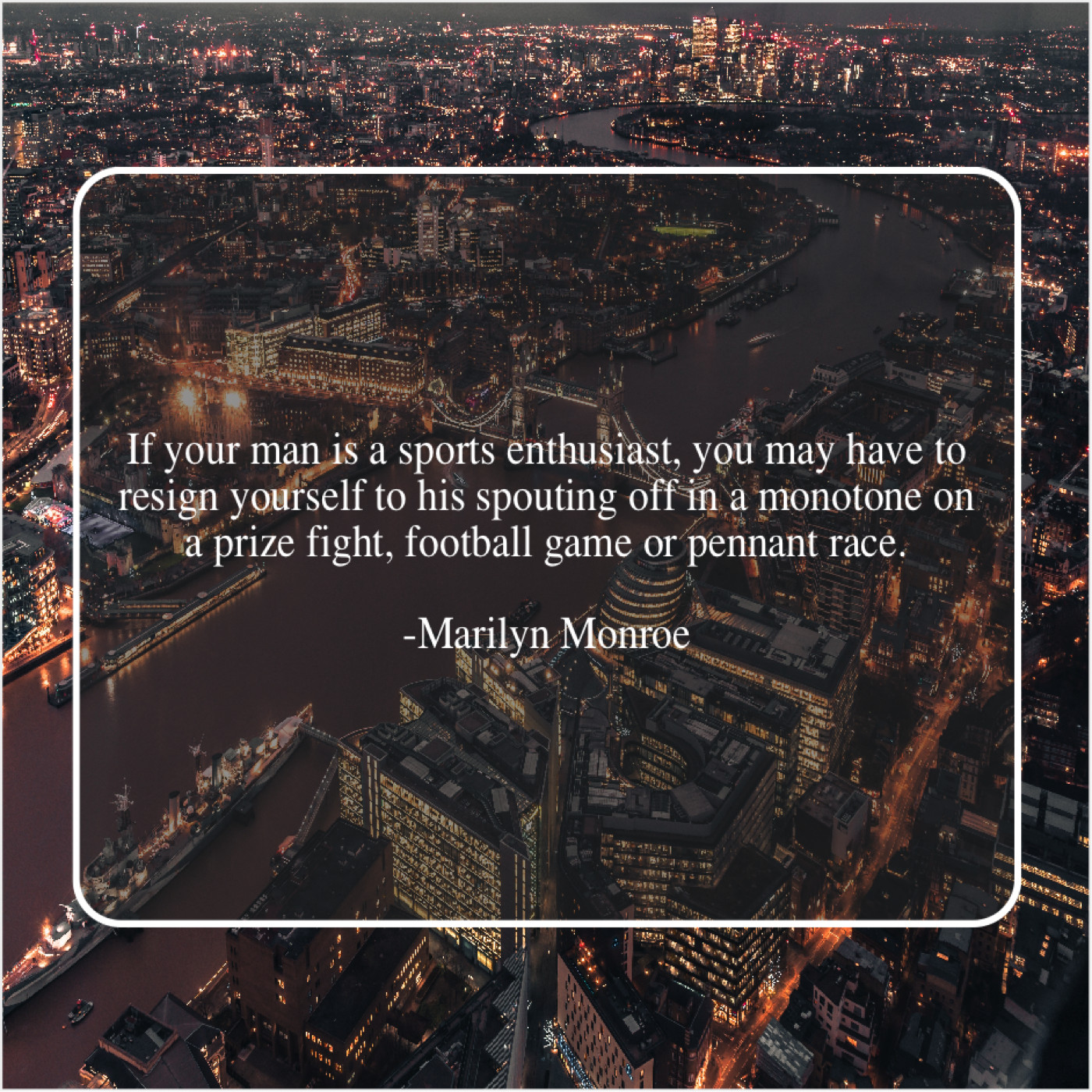 Marilyn Monroe Marilyn Monroe – If your man is a… July 30, 2019 admin “If your man is a sports enthusiast, you may have to resign yourself to his spouting off in a monotone on a prize fight, football game or pennant race.”-Marilyn Monroe
