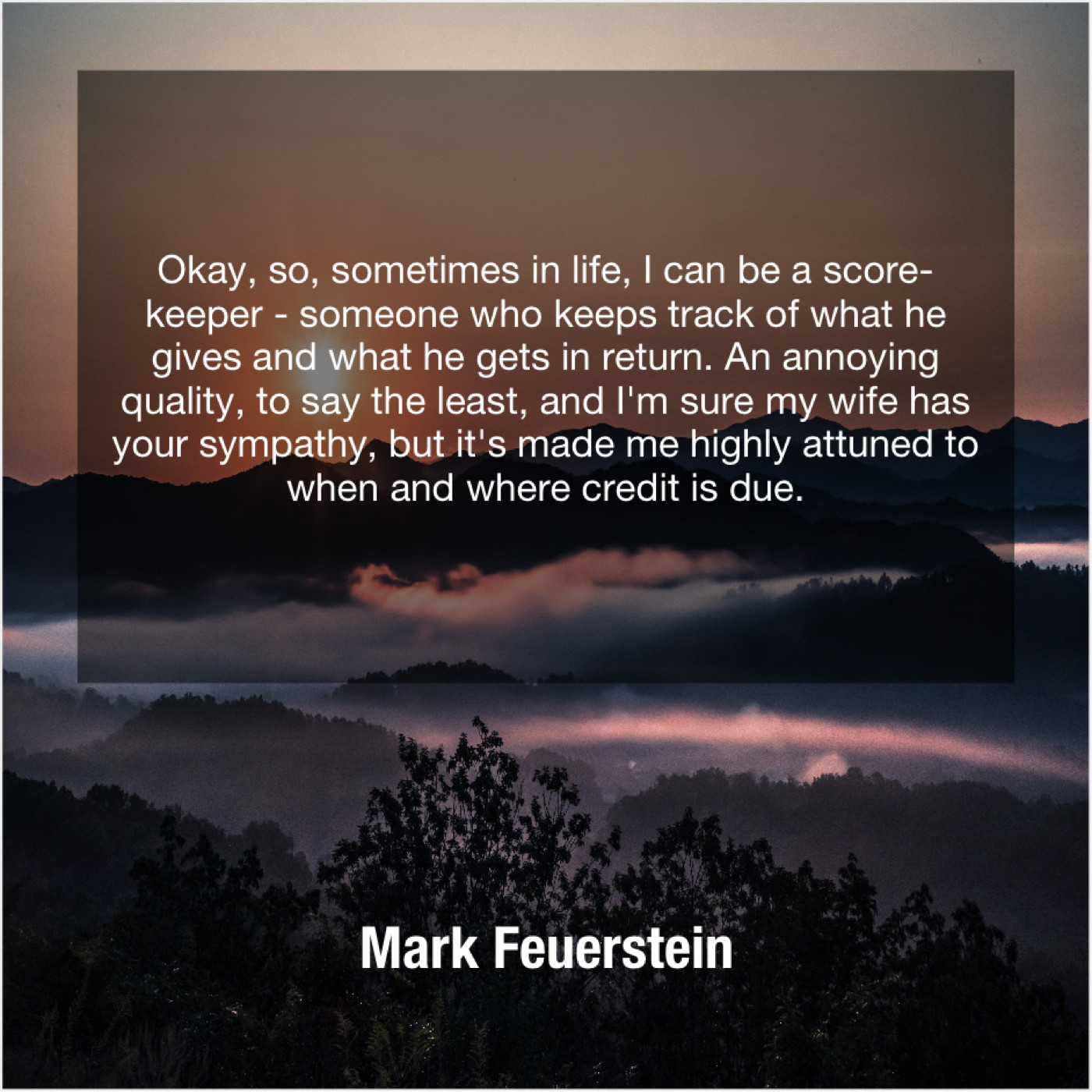 “Okay, so, sometimes in life, I can be a score-keeper – someone who keeps track of what he gives and what he gets in return. An annoying quality, to say the least, and I’m sure my wife has your sympathy, but it’s made me highly attuned to when and where credit is due.”