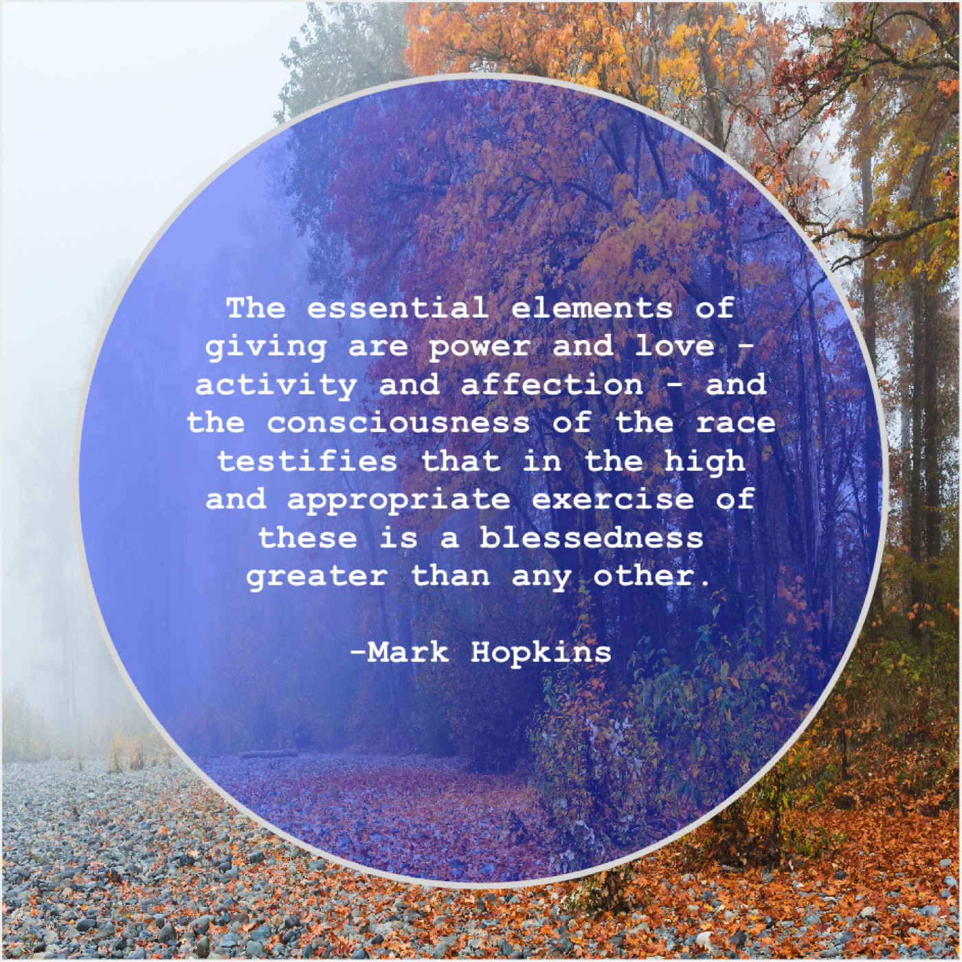 Mark Hopkins Mark Hopkins – The essential elements of giving… February 5, 2019 admin “The essential elements of giving are power and love – activity and affection – and the consciousness of the race testifies that in the high and appropriate exercise of these is a blessedness greater than any other.”-Mark Hopkins
