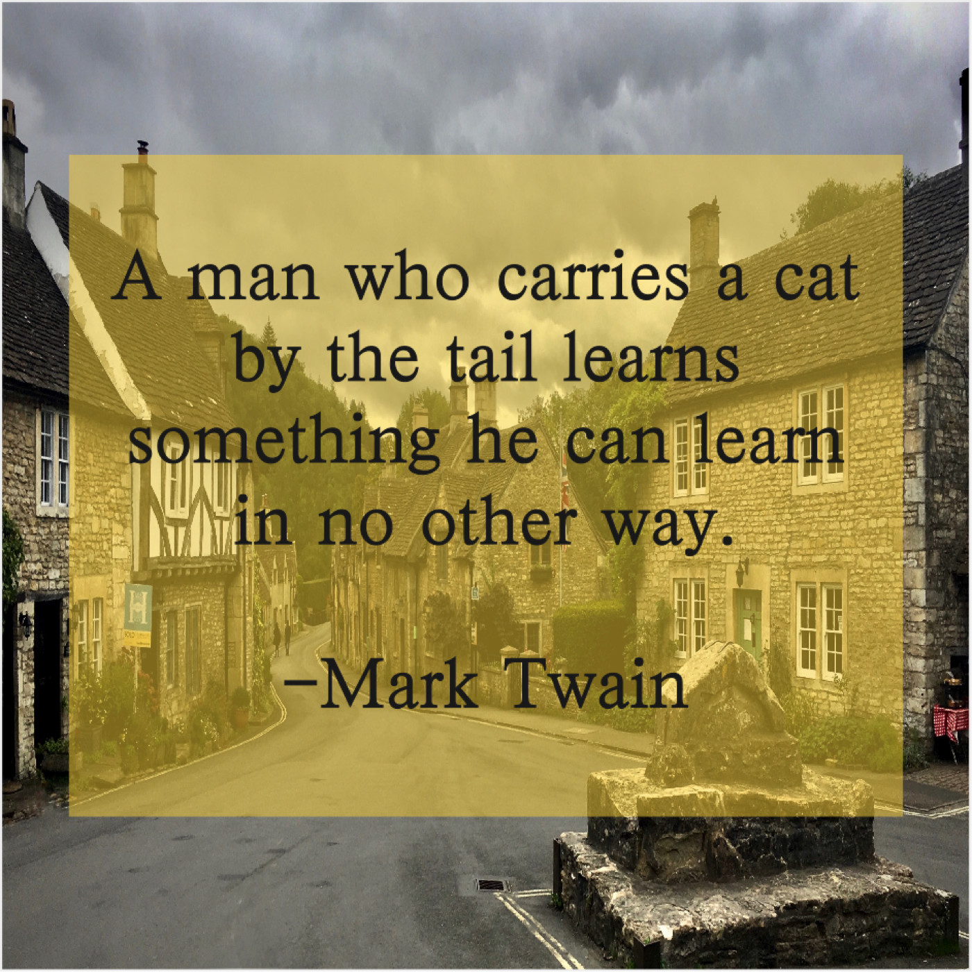 Mark Twain Mark Twain – A man who carries a… October 10, 2019 admin “A man who carries a cat by the tail learns something he can learn in no other way.”-Mark Twain