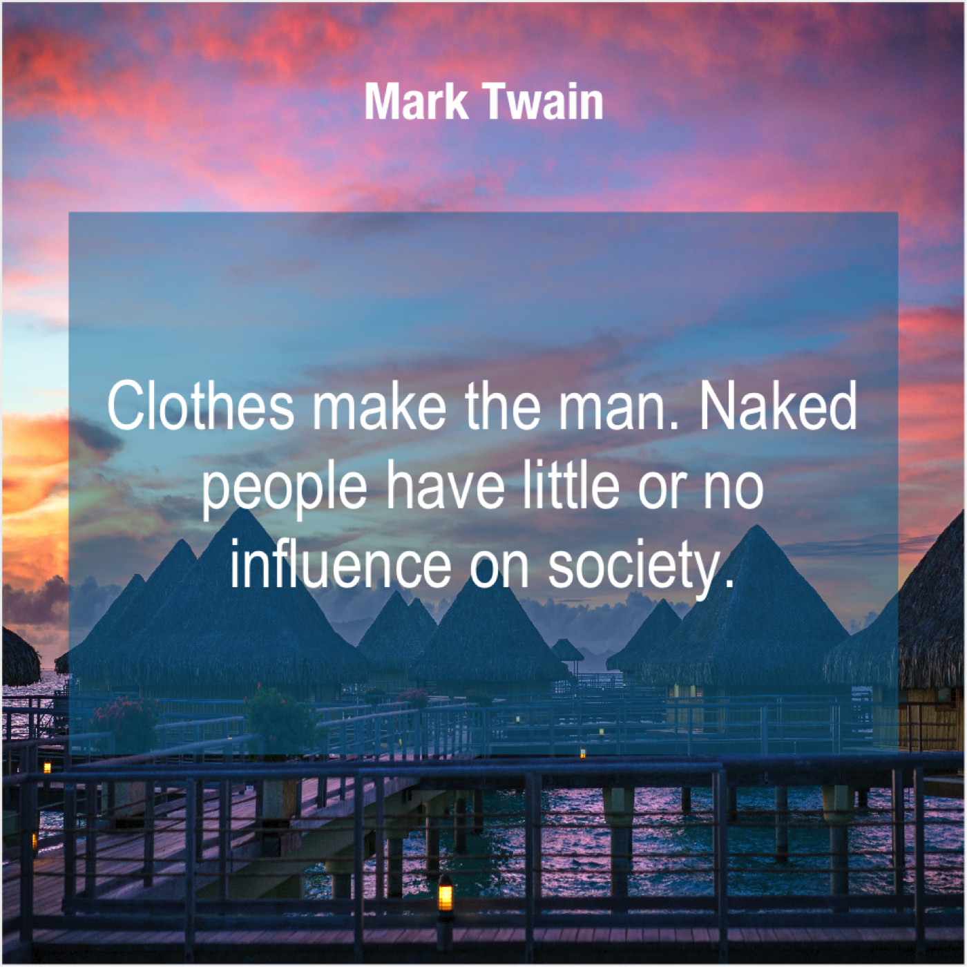 Mark Twain Mark Twain – Clothes make the man. Naked… March 29, 2019 admin “Clothes make the man. Naked people have little or no influence on society.”-Mark Twain