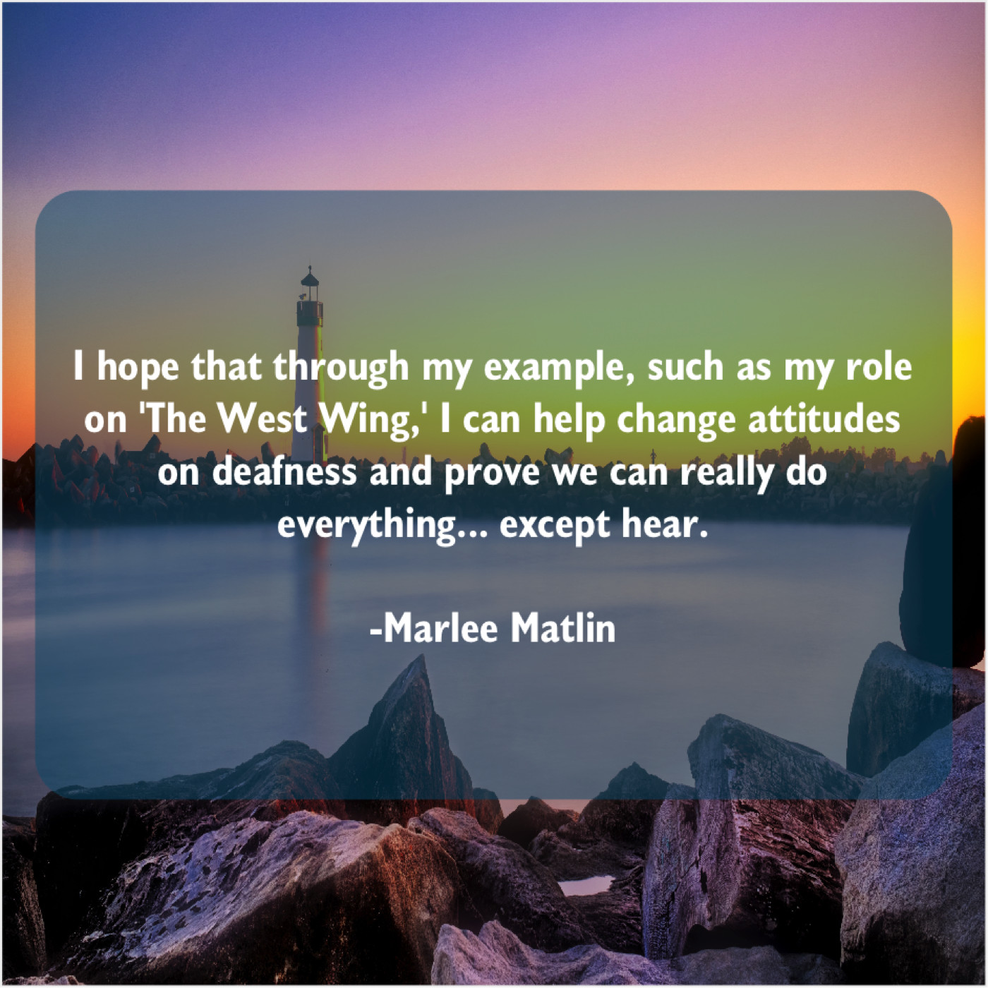 Marlee Matlin Marlee Matlin – I hope that through my… March 14, 2019 admin “I hope that through my example, such as my role on ‘The West Wing,’ I can help change attitudes on deafness and prove we can really do everything… except hear.”-Marlee Matlin