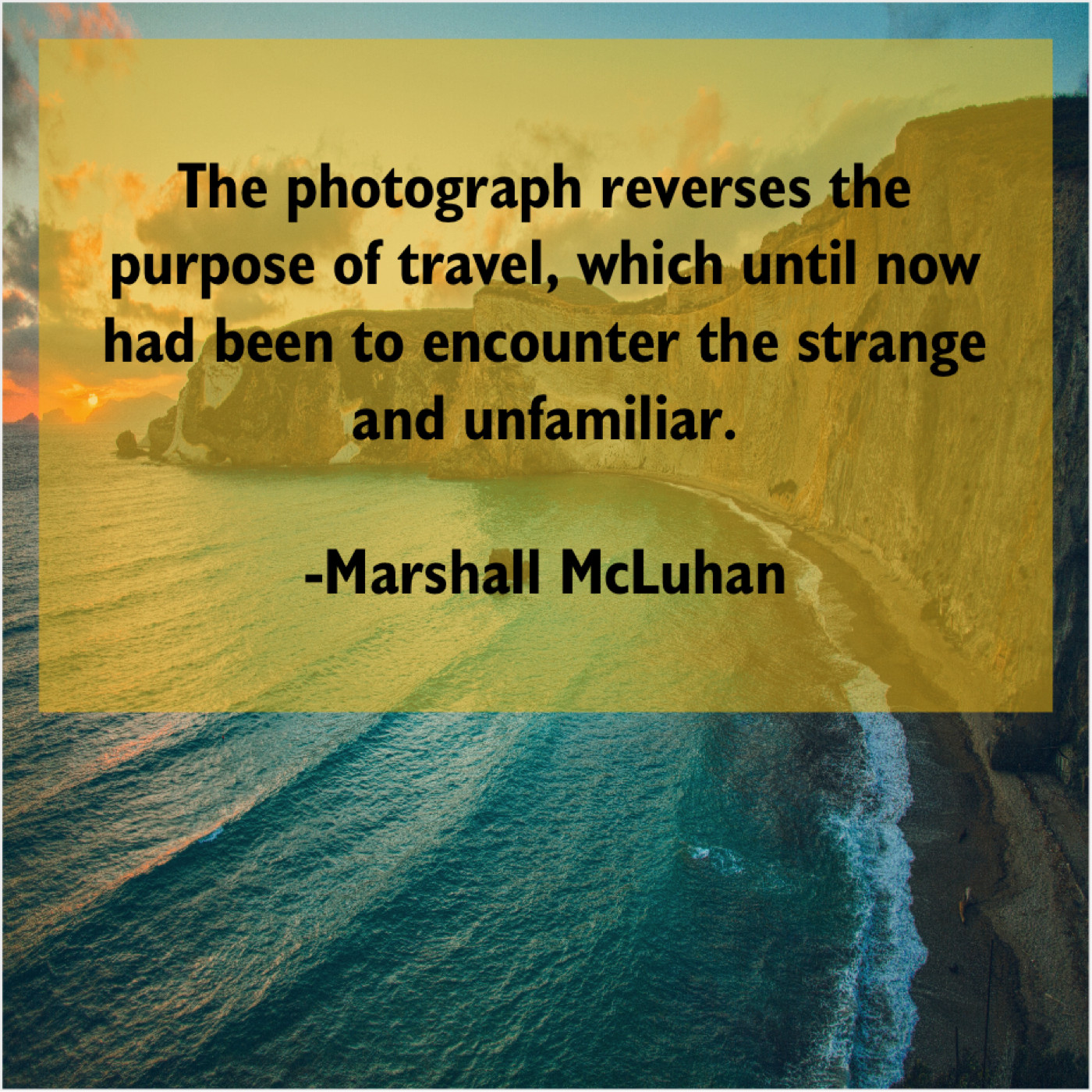 Marshall McLuhan Marshall McLuhan – The photograph reverses the purpose… May 20, 2019 admin “The photograph reverses the purpose of travel, which until now had been to encounter the strange and unfamiliar.”-Marshall McLuhan