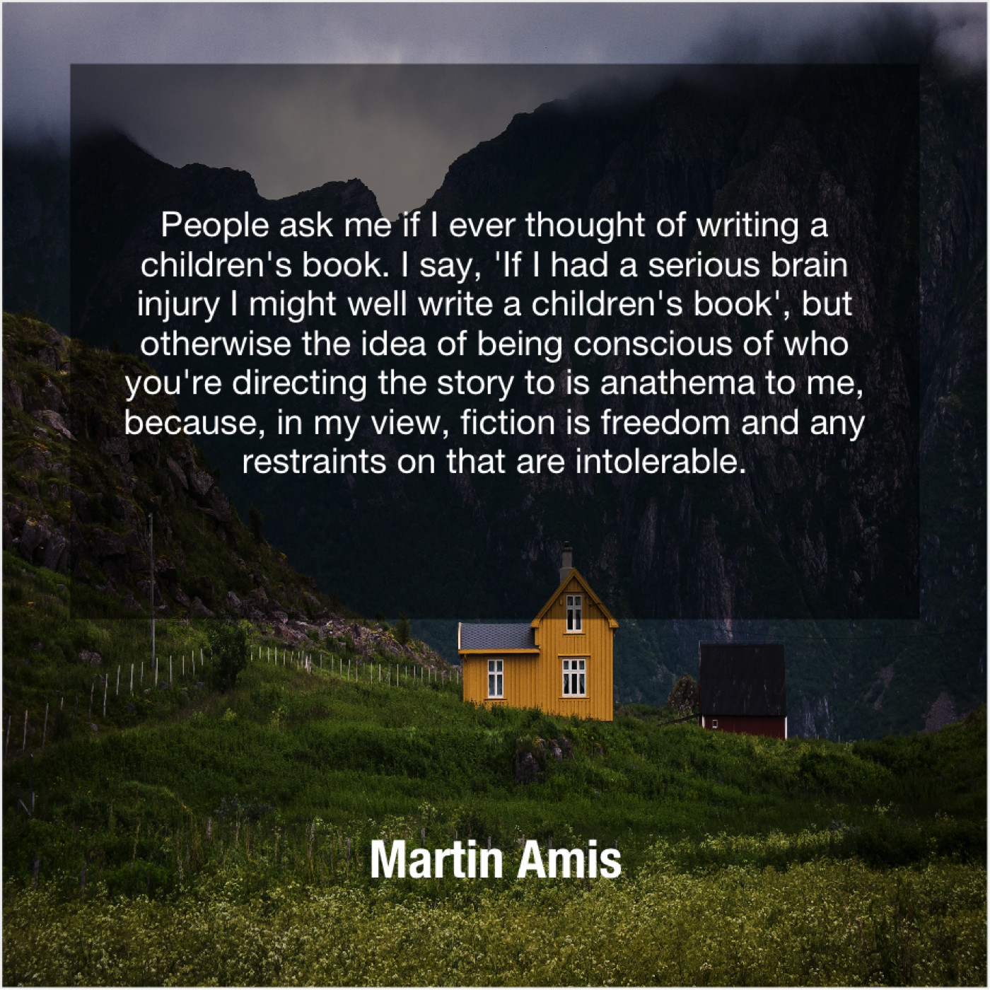 “People ask me if I ever thought of writing a children’s book. I say, ‘If I had a serious brain injury I might well write a children’s book’, but otherwise the idea of being conscious of who you’re directing the story to is anathema to me, because, in my view, fiction is freedom and any restraints on that are intolerable.”