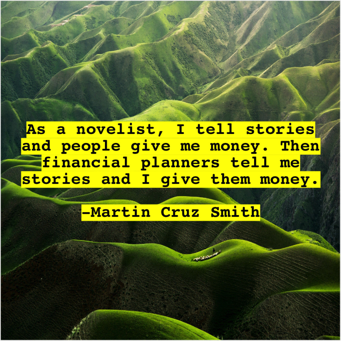 Martin Cruz Smith Martin Cruz Smith – As a novelist, I tell… December 5, 2018 admin “As a novelist, I tell stories and people give me money. Then financial planners tell me stories and I give them money.”-Martin Cruz Smith