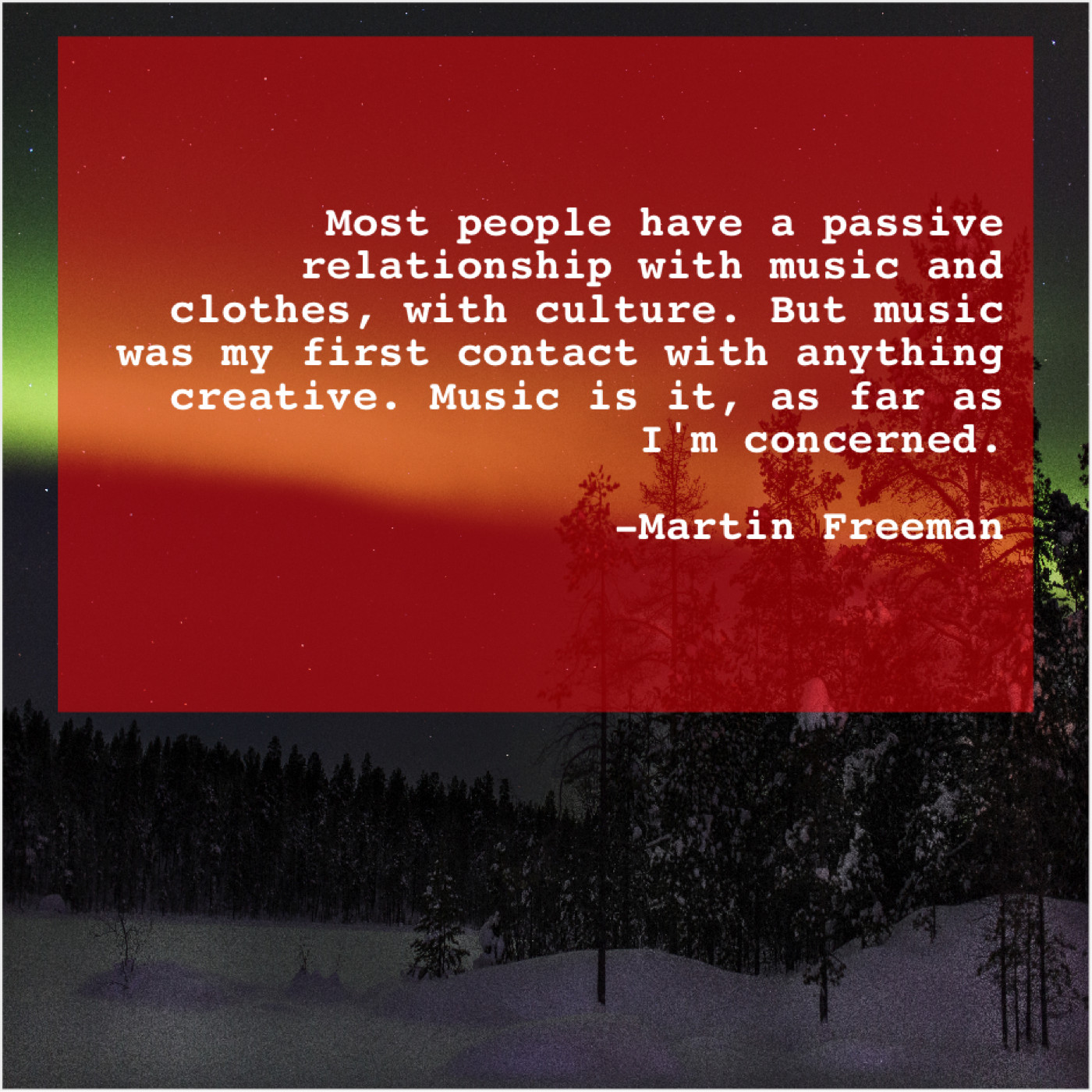 Martin Freeman Martin Freeman – Most people have a passive… March 17, 2019 admin “Most people have a passive relationship with music and clothes, with culture. But music was my first contact with anything creative. Music is it, as far as I’m concerned.”-Martin Freeman
