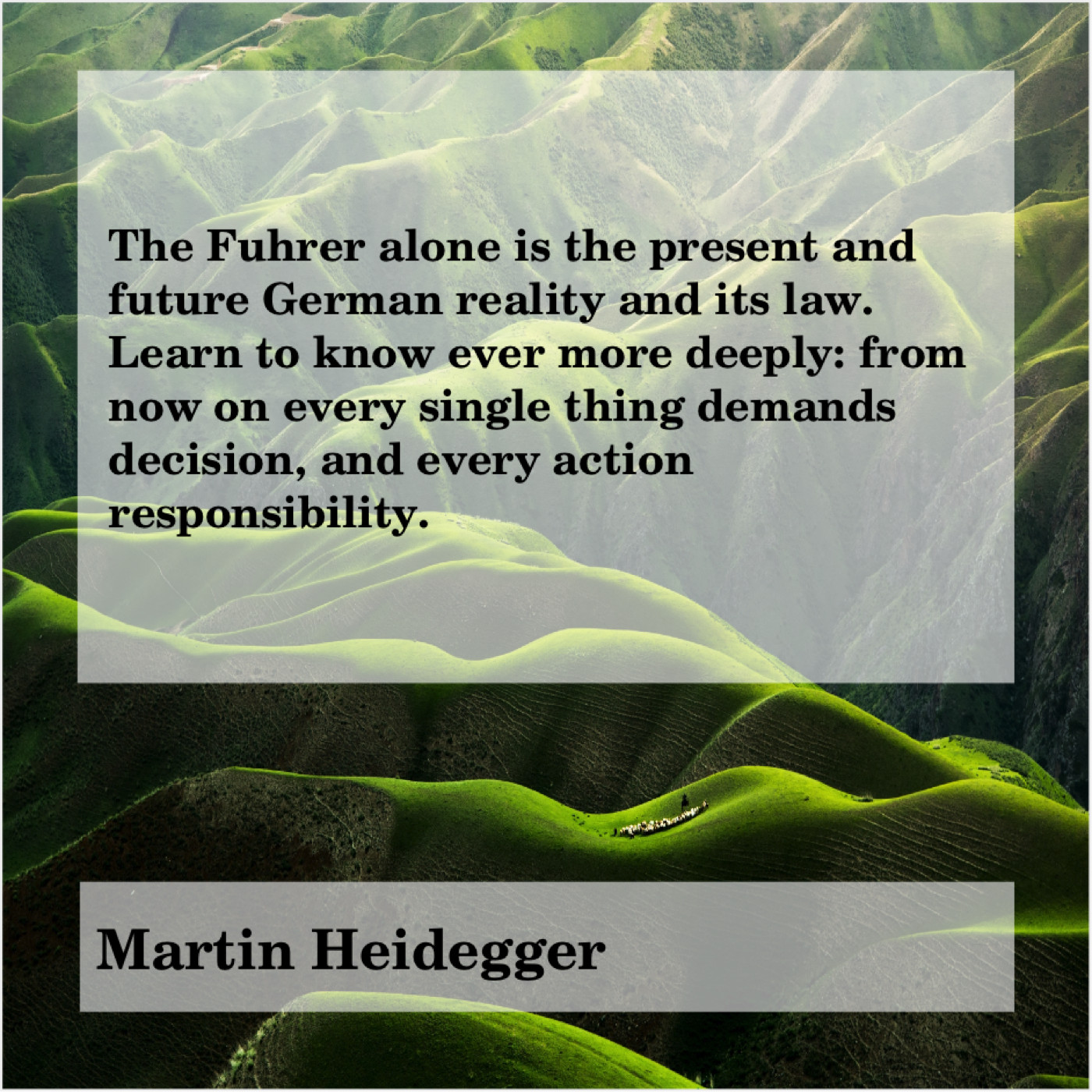 Martin Heidegger Martin Heidegger – The Fuhrer alone is the… October 14, 2019 admin “The Fuhrer alone is the present and future German reality and its law. Learn to know ever more deeply: from now on every single thing demands decision, and every action responsibility.”-Martin Heidegger