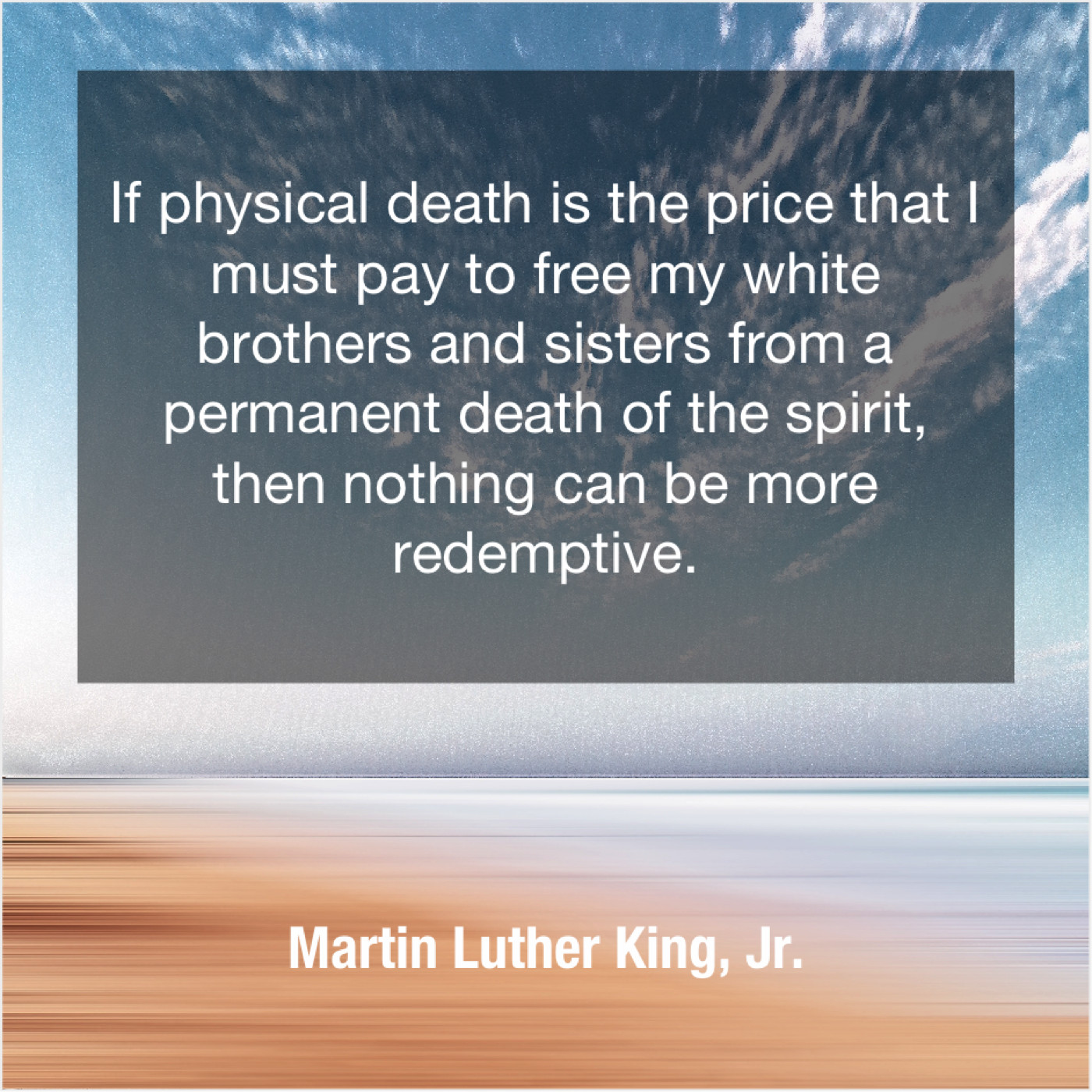 Martin Luther King, Jr. Martin Luther King, Jr. – If physical death is the… July 17, 2019 admin “If physical death is the price that I must pay to free my white brothers and sisters from a permanent death of the spirit, then nothing can be more redemptive.”-Martin Luther King, Jr.