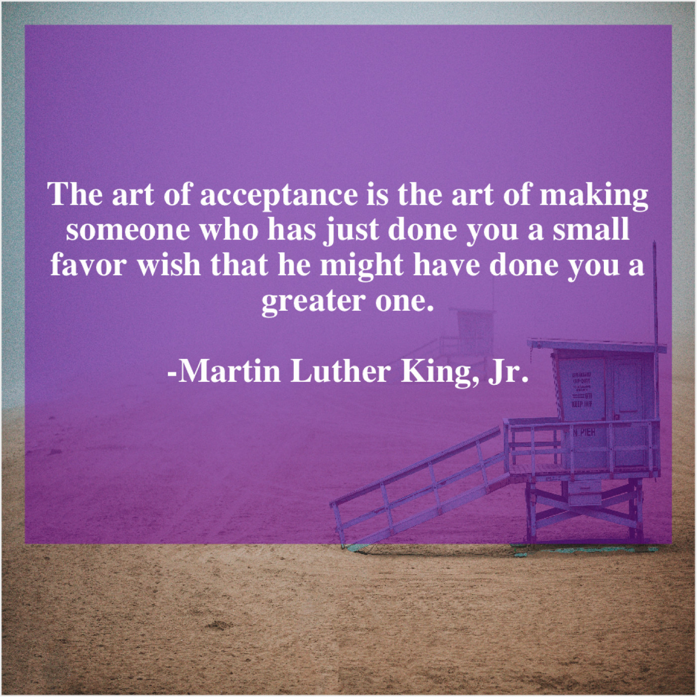 Martin Luther King, Jr. Martin Luther King, Jr. – The art of acceptance is… May 27, 2019 admin “The art of acceptance is the art of making someone who has just done you a small favor wish that he might have done you a greater one.”-Martin Luther King, Jr.