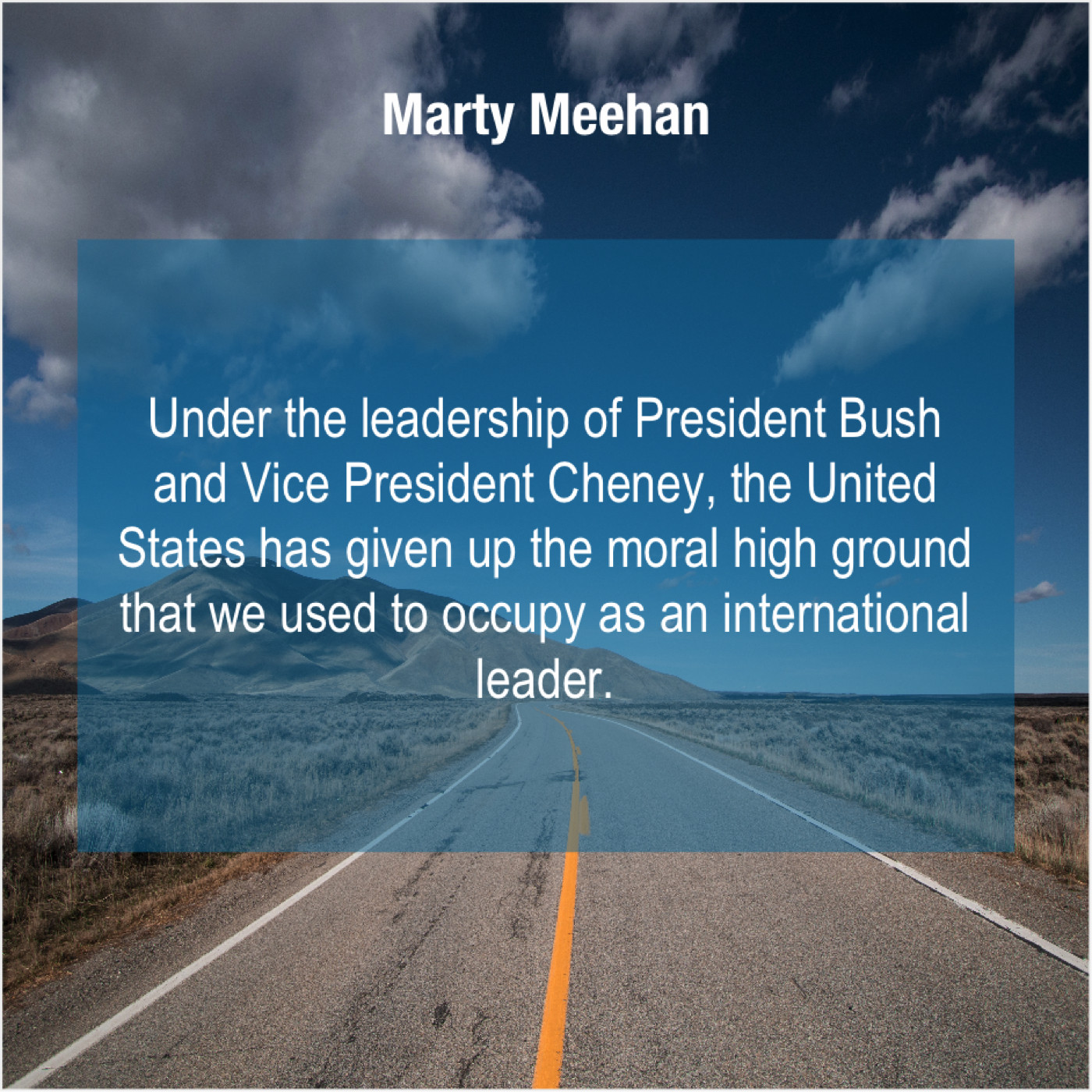 Marty Meehan Marty Meehan – Under the leadership of President… March 23, 2019 admin “Under the leadership of President Bush and Vice President Cheney, the United States has given up the moral high ground that we used to occupy as an international leader.”-Marty Meehan