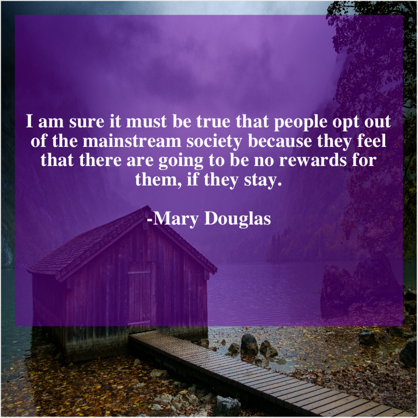 Mary Douglas Mary Douglas – I am sure it must… March 21, 2019 admin “I am sure it must be true that people opt out of the mainstream society because they feel that there are going to be no rewards for them, if they stay.”-Mary Douglas