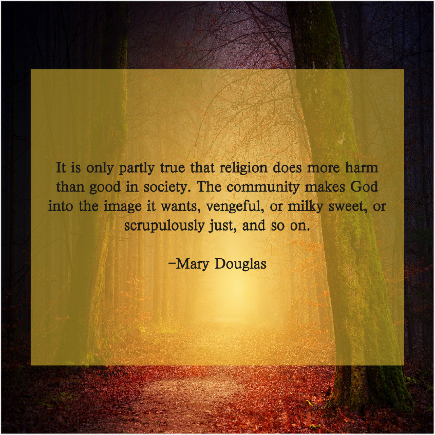 Mary Douglas Mary Douglas – It is only partly true… March 14, 2019 admin “It is only partly true that religion does more harm than good in society. The community makes God into the image it wants, vengeful, or milky sweet, or scrupulously just, and so on.”-Mary Douglas