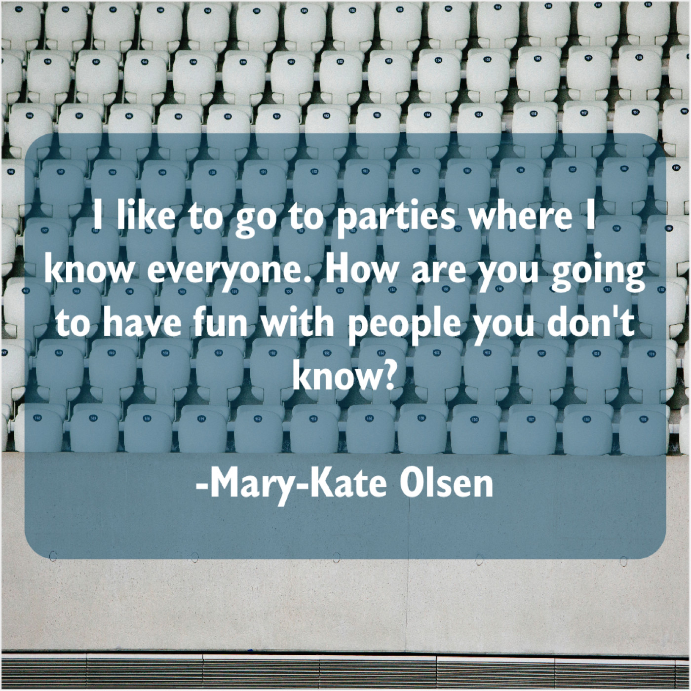 Mary-Kate Olsen Mary-Kate Olsen – I like to go to… July 14, 2019 admin “I like to go to parties where I know everyone. How are you going to have fun with people you don’t know?”-Mary-Kate Olsen
