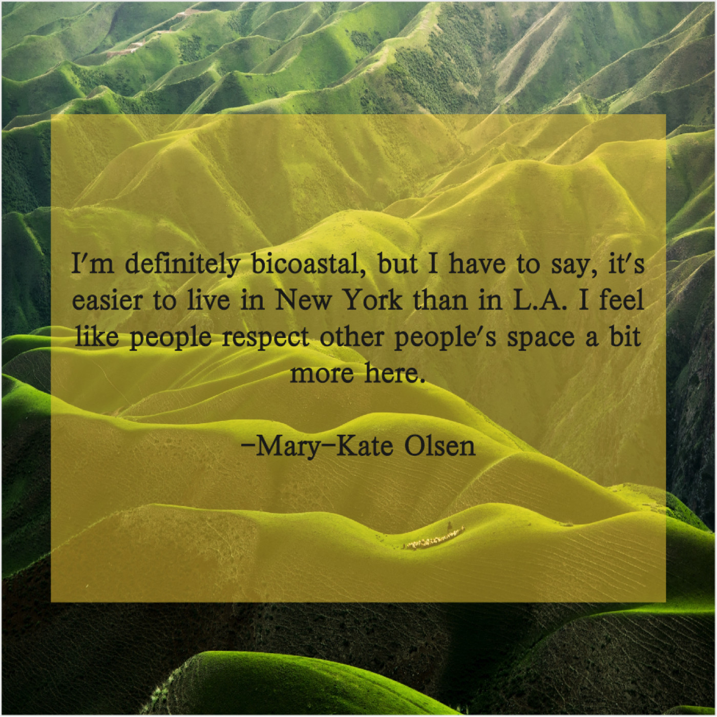 Mary-Kate Olsen Mary-Kate Olsen – I’m definitely bicoastal, but I… October 1, 2019 admin “I’m definitely bicoastal, but I have to say, it’s easier to live in New York than in L.A. I feel like people respect other people’s space a bit more here.”-Mary-Kate Olsen