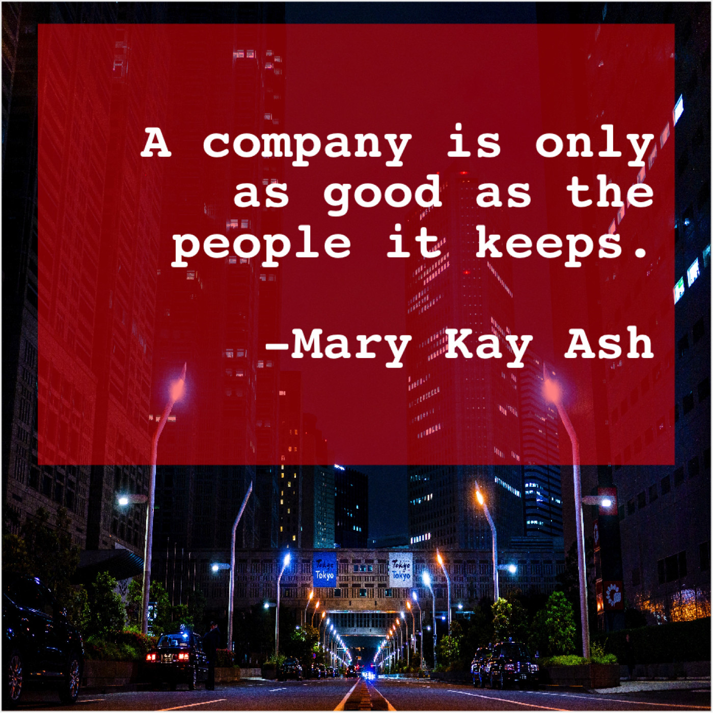 Mary Kay Ash Mary Kay Ash – A company is only as… July 26, 2019 admin “A company is only as good as the people it keeps.”-Mary Kay Ash