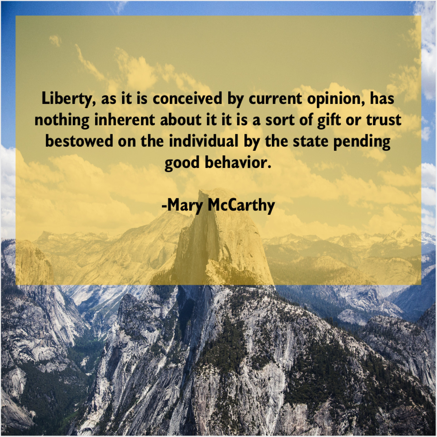 Mary McCarthy Mary McCarthy – Liberty, as it is conceived… February 25, 2019 admin “Liberty, as it is conceived by current opinion, has nothing inherent about it it is a sort of gift or trust bestowed on the individual by the state pending good behavior.”-Mary McCarthy