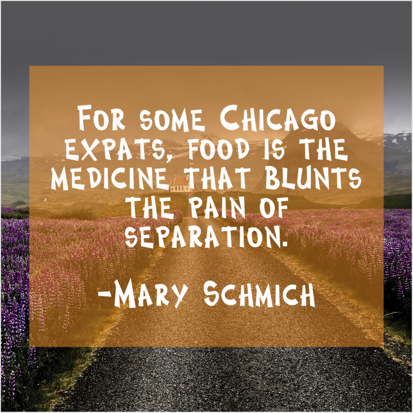 Mary Schmich Mary Schmich – For some Chicago expats, food… May 11, 2019 admin “For some Chicago expats, food is the medicine that blunts the pain of separation.”-Mary Schmich