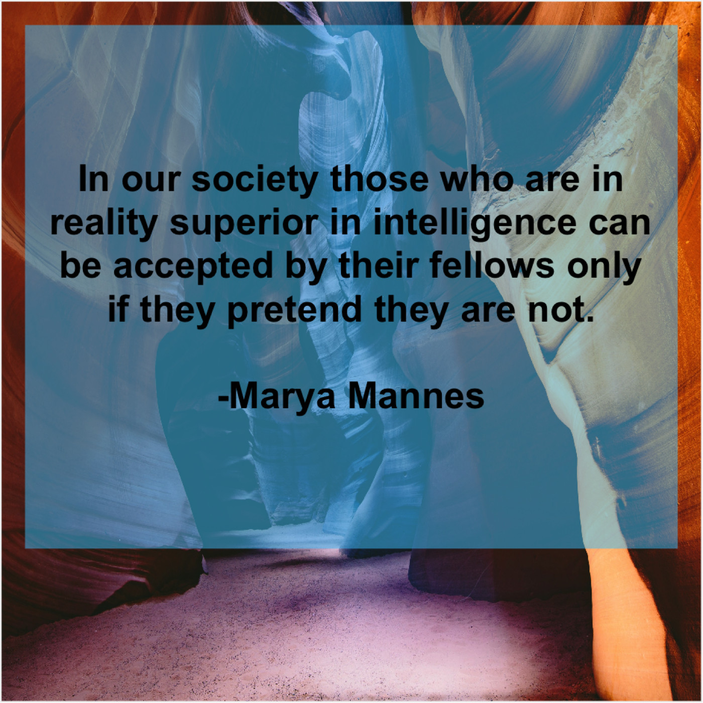 Marya Mannes Marya Mannes – In our society those who… September 22, 2019 admin “In our society those who are in reality superior in intelligence can be accepted by their fellows only if they pretend they are not.”-Marya Mannes